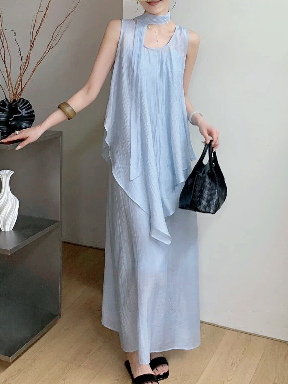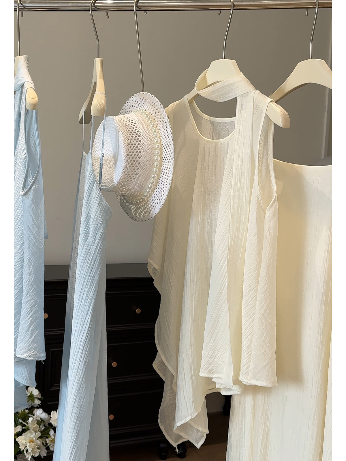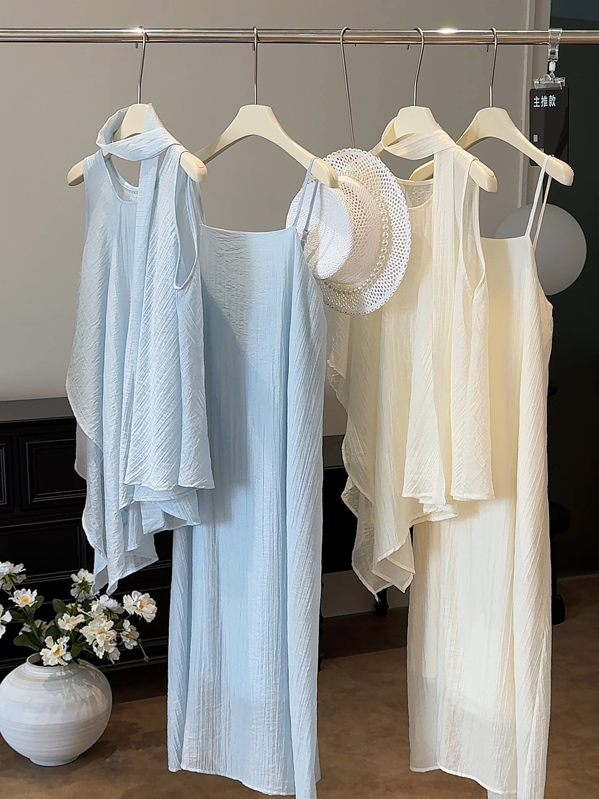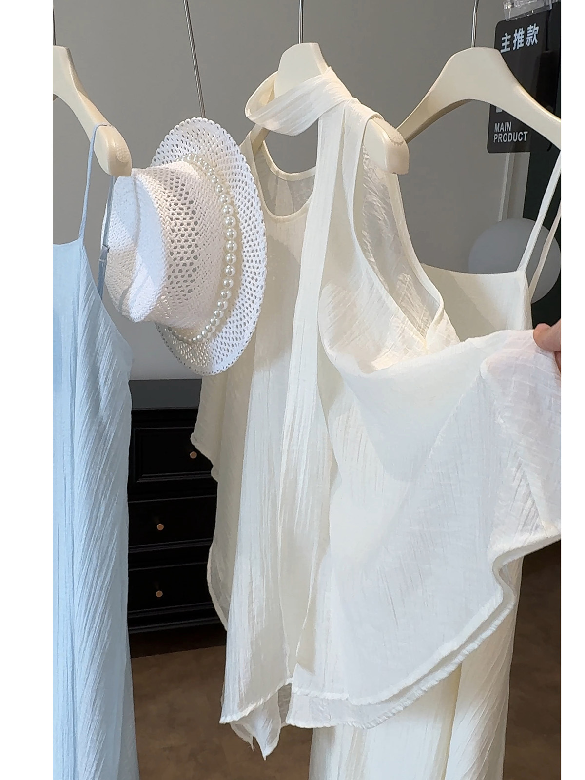 绝美漂亮海边度假风薄纱不规则背心+大摆吊带裙连衣裙飘带三件套