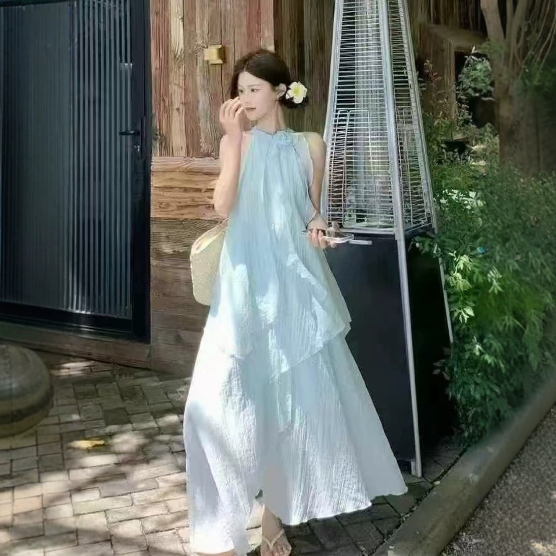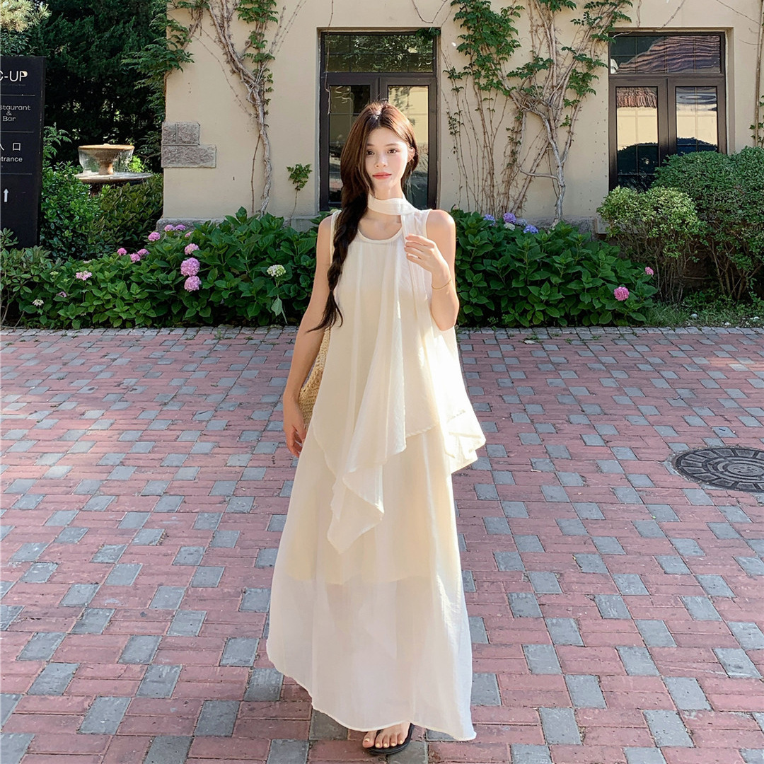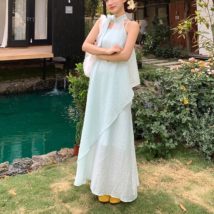 法式气质无袖挂脖吊带连衣裙子女夏季2026新款海边度假不规则长裙