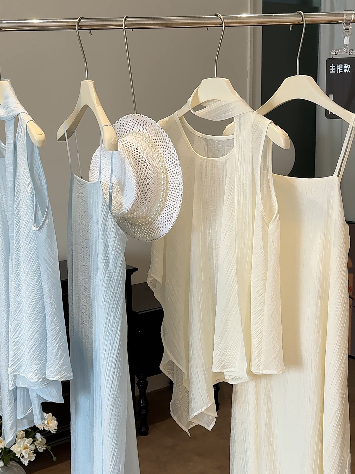 海南三亚海边度假女夏季高级感绝美白色法式挂脖吊带连衣裙子套装