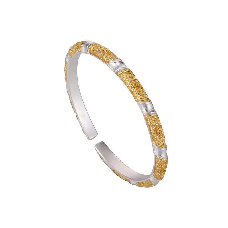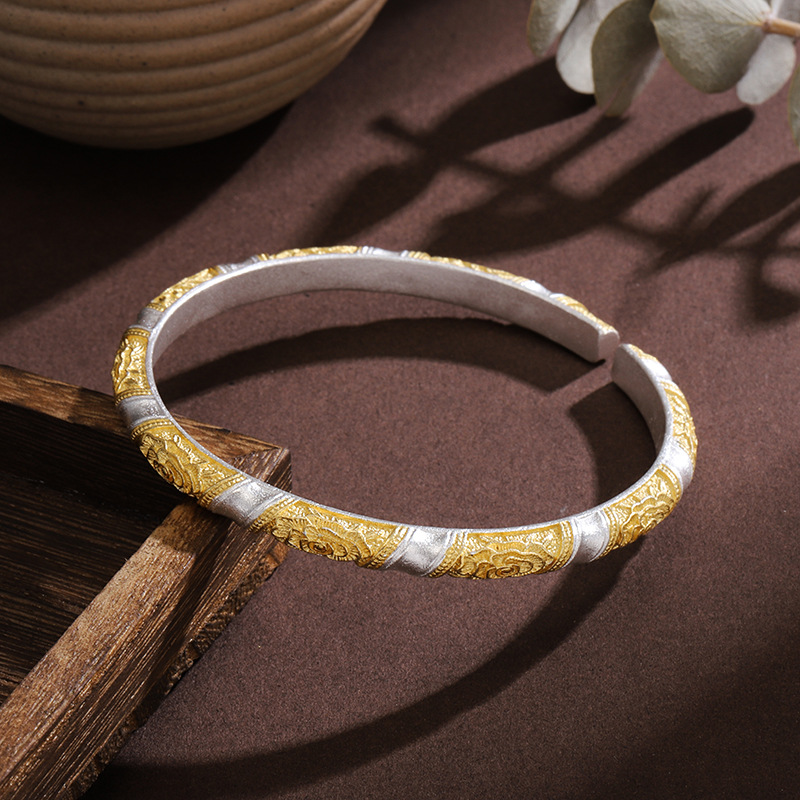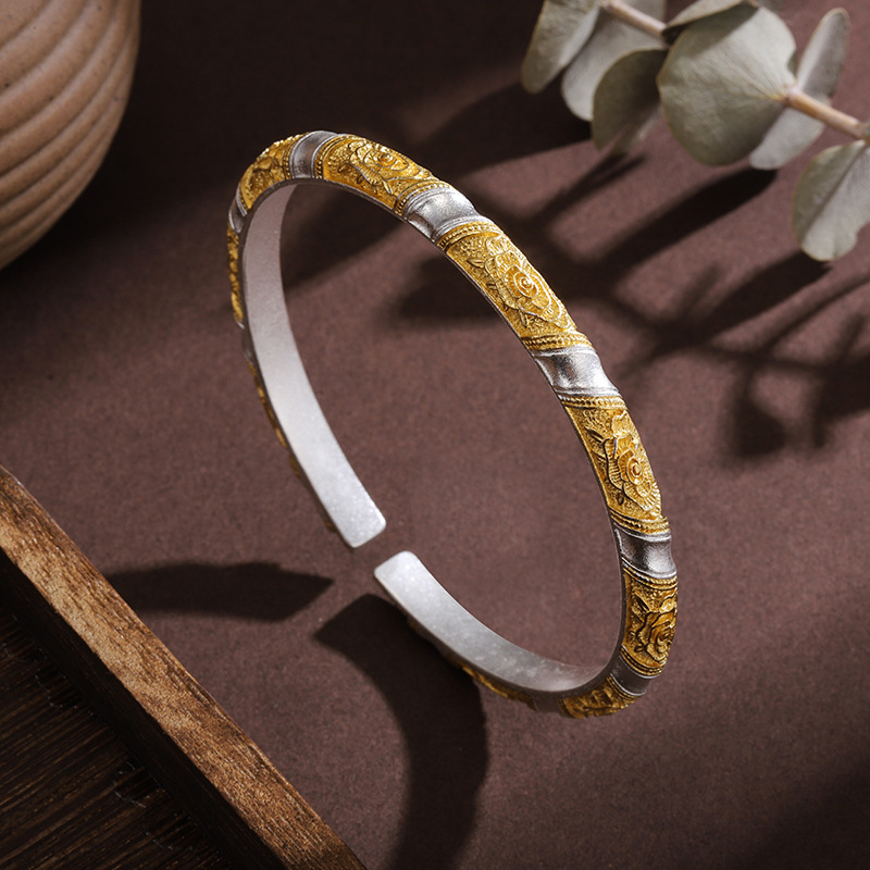 白铜镀银手镯描金雕花牡丹手镯女款新中式国风繁花手镯百搭礼物