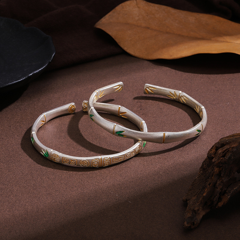 白铜镀银手镯新中式古法竹节描金吉言实心珐琅彩国潮风镯子礼物女