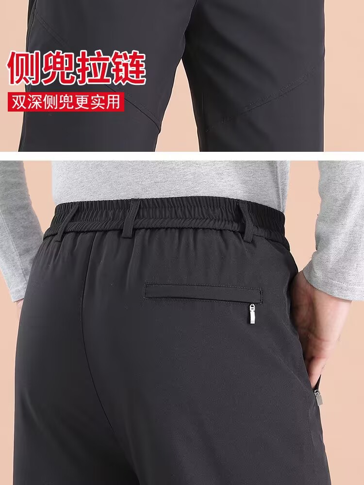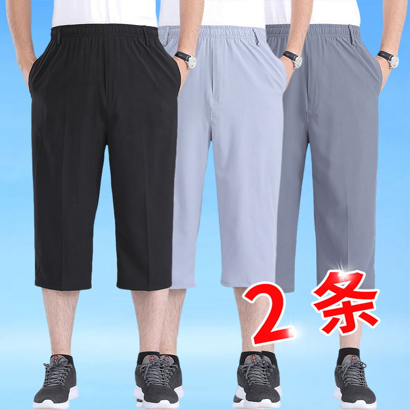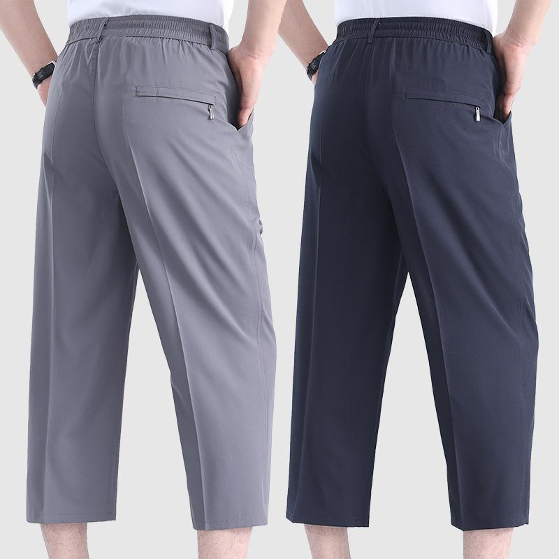 中高年男性の夏用薄手のアイスシルク8点パンツ、ゆったりカジュアルなお父さん、高齢者向けの伸縮性ウエスト、夏用涼しいミドルパンツ