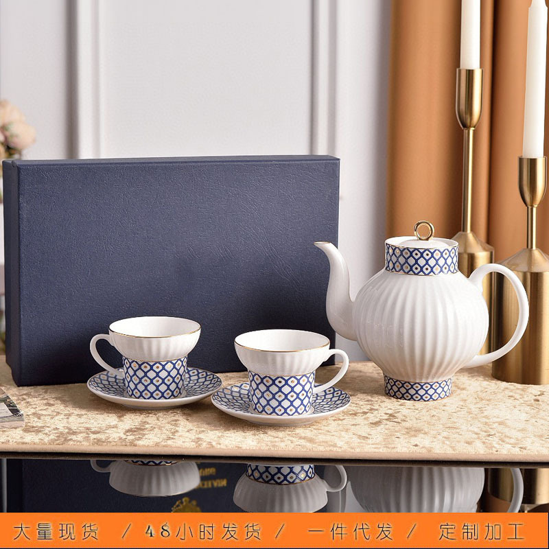 クラシックホワイトコバルトブルーリースボーンチャイナハイエンド絶妙なコーヒーカップとソーサーアフタヌーンティーティーセットティーポットセットギフト卸売