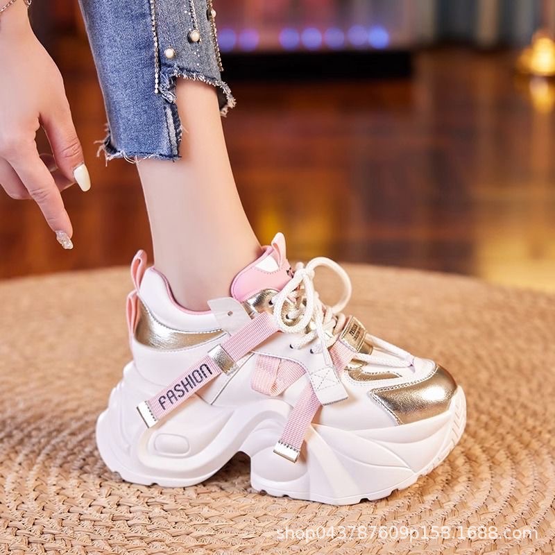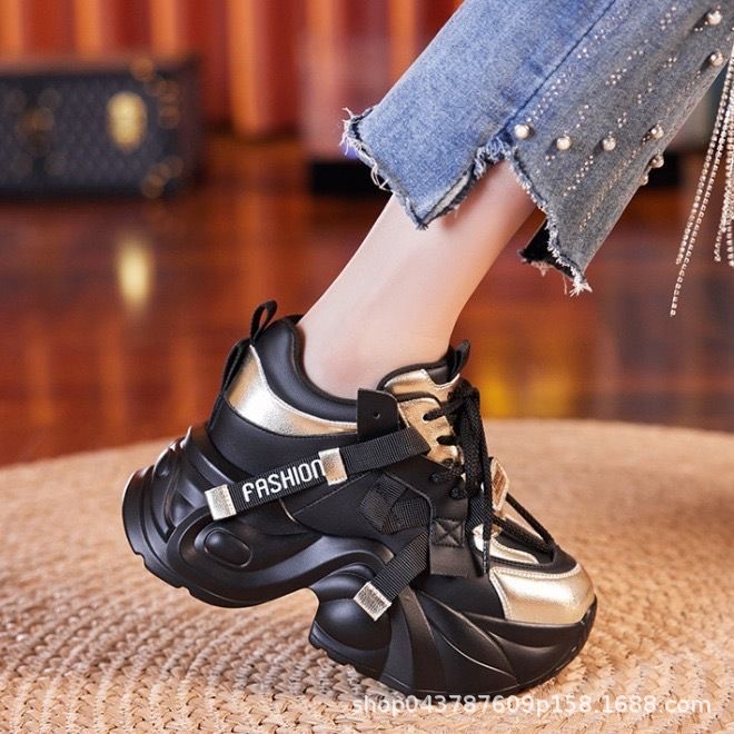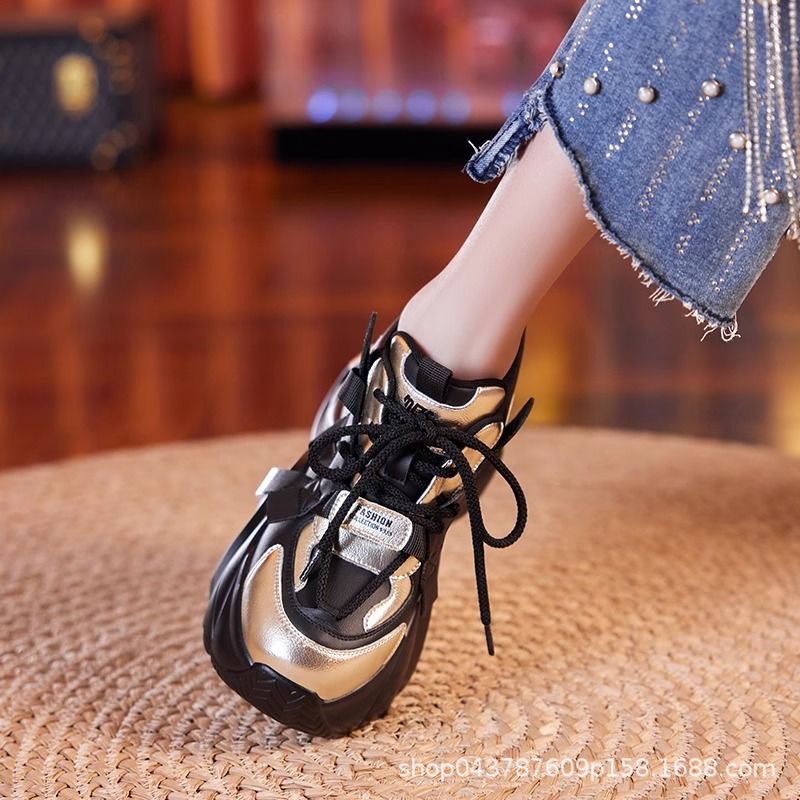 お父さんの靴の黒い金は色の女性にぶつかって2025年の春秋の新型の韓国版はやせている厚い底の8cmの軽やかな百合の運動靴を現します。