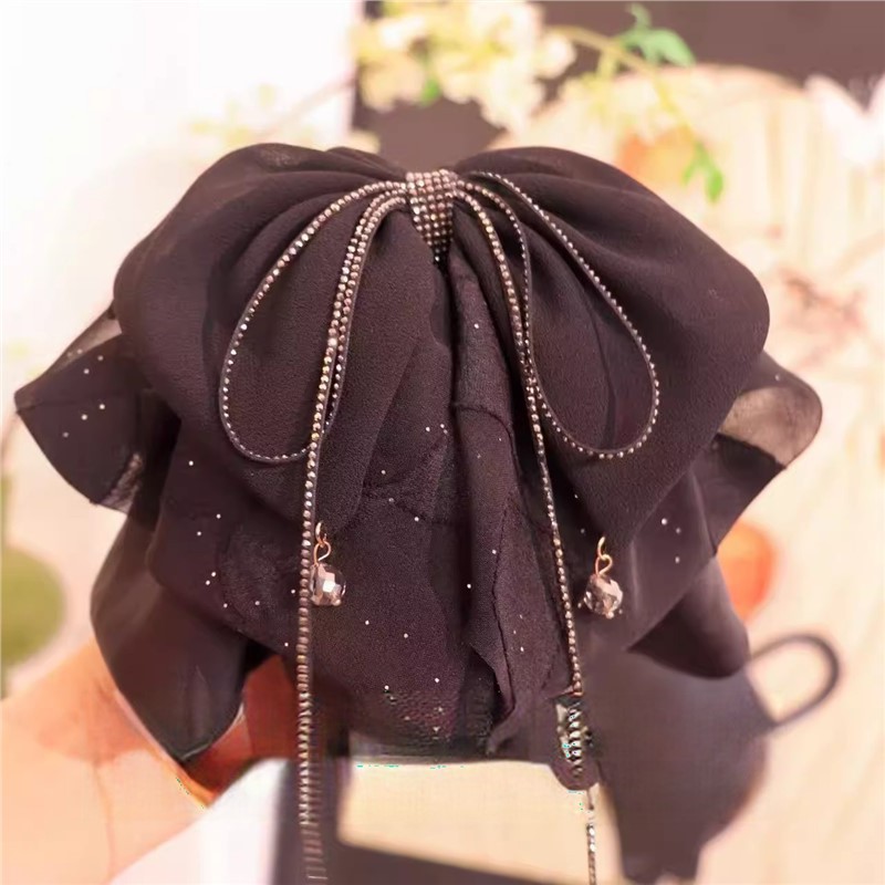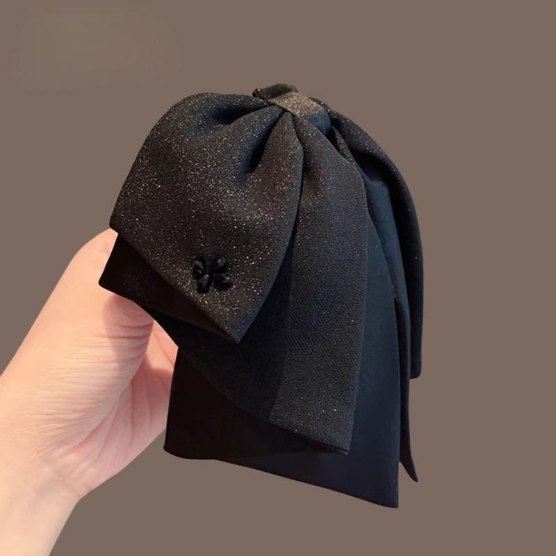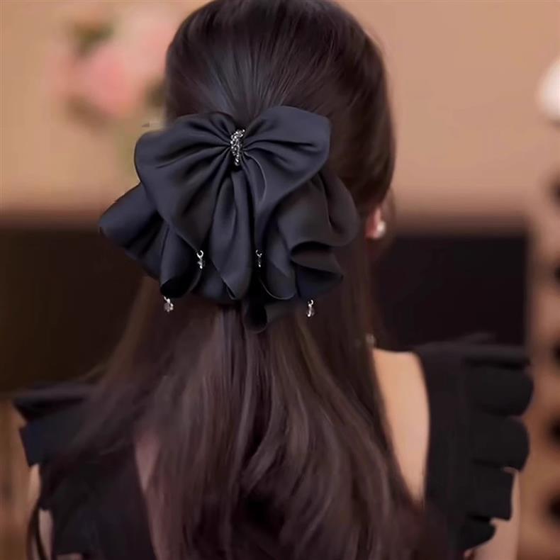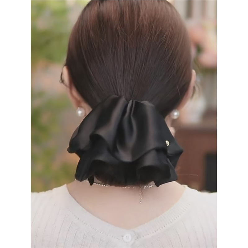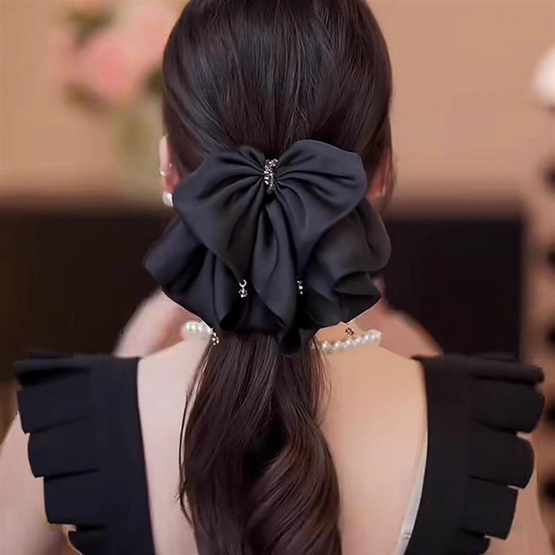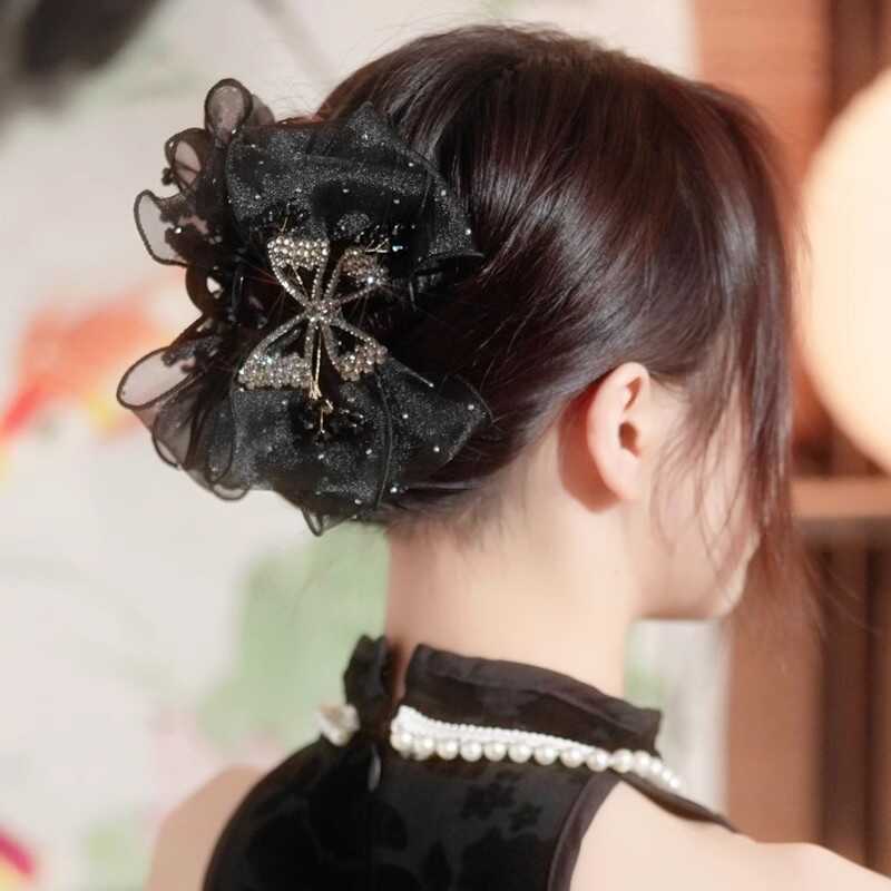 2025年新作韓国シフォンブラックリボンポニーテールクリップ後頭部用、髪のボリュームを高める高級ヘアクリップ