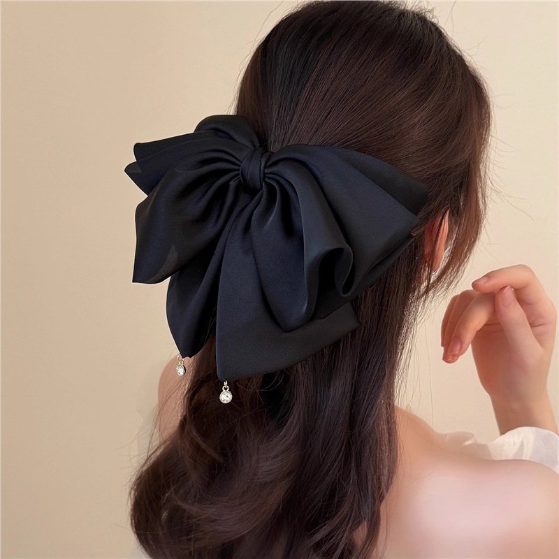 高级感超大多层缎面蝴蝶结马尾夹女法式复古绝美珍珠吊坠百搭发夹