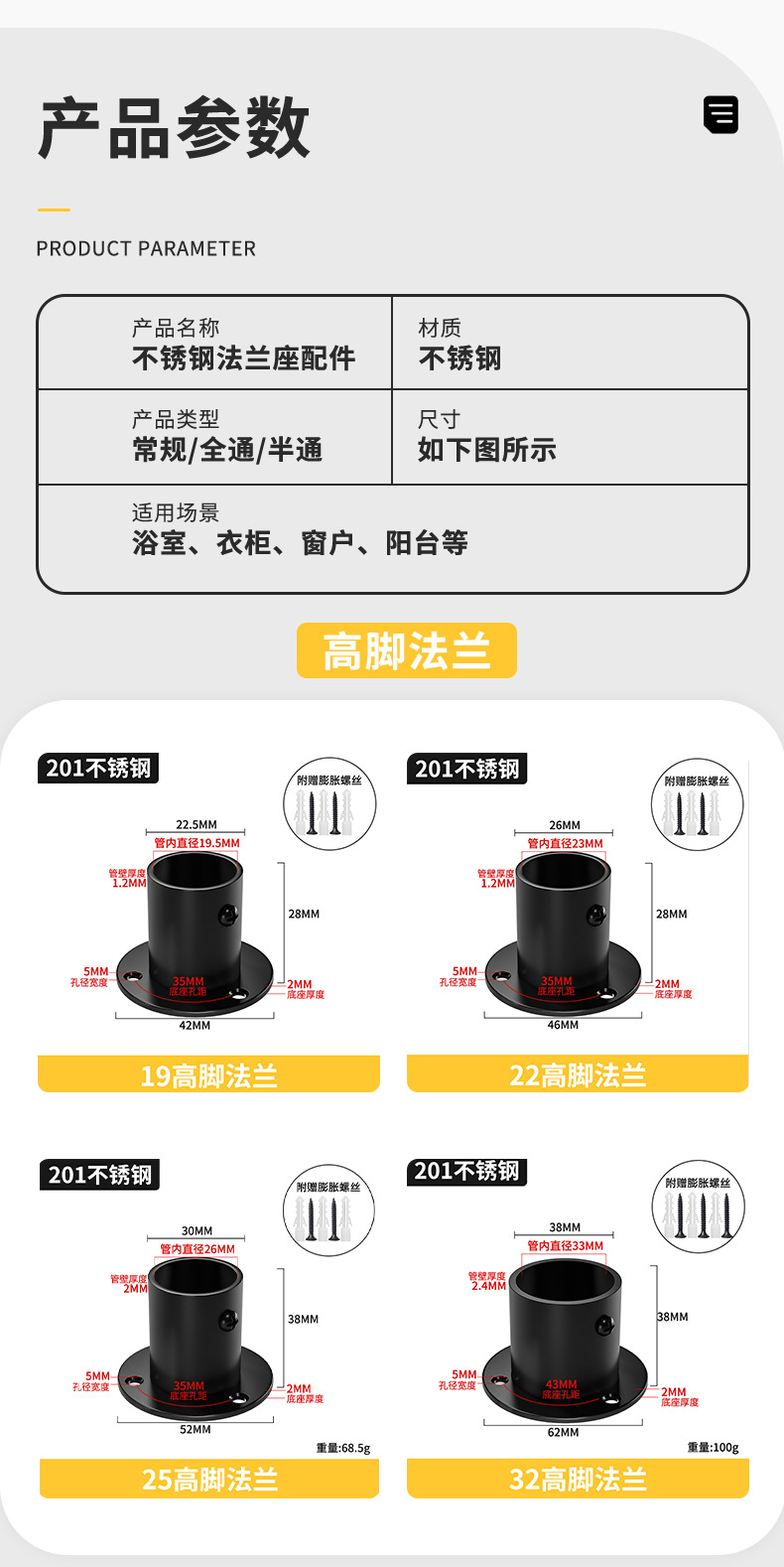 厚い304ステンレス高脚フランジ座高脚衣丸管座タオル管座カーテン座