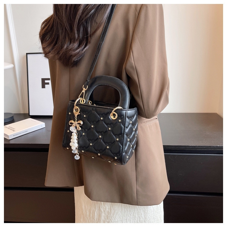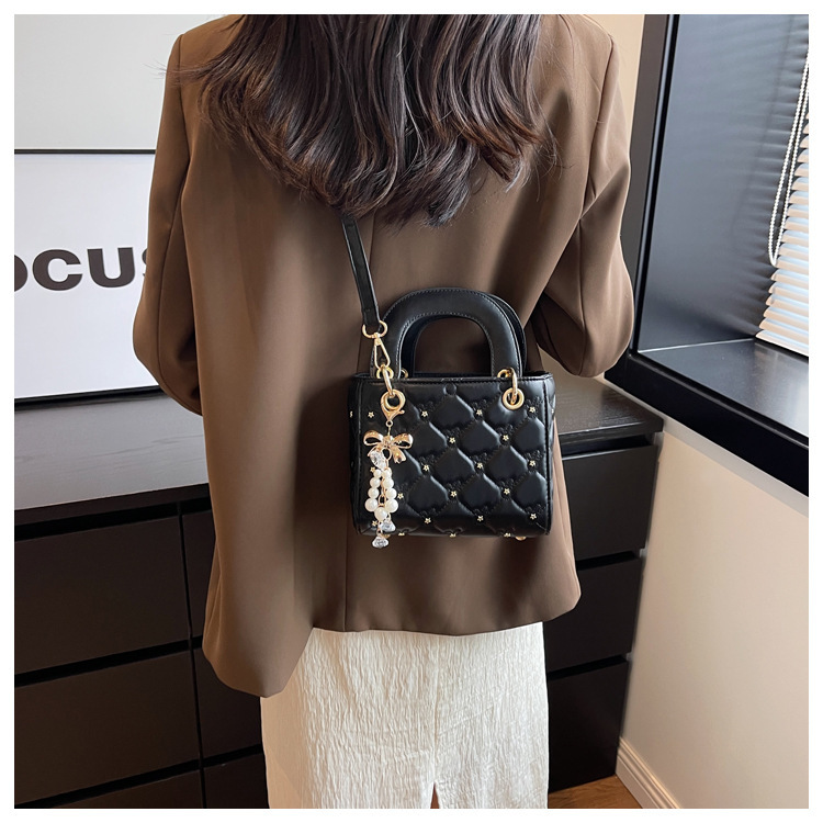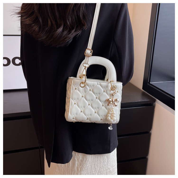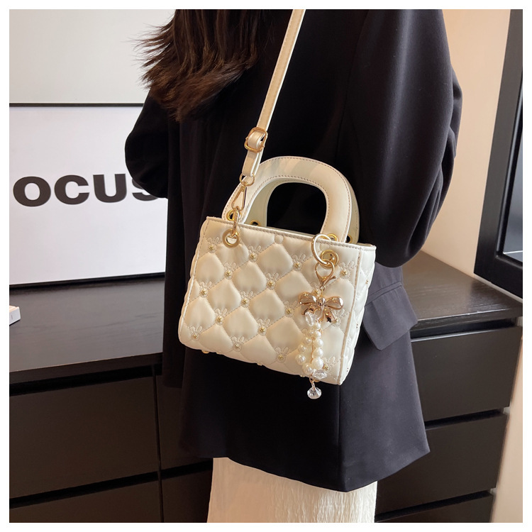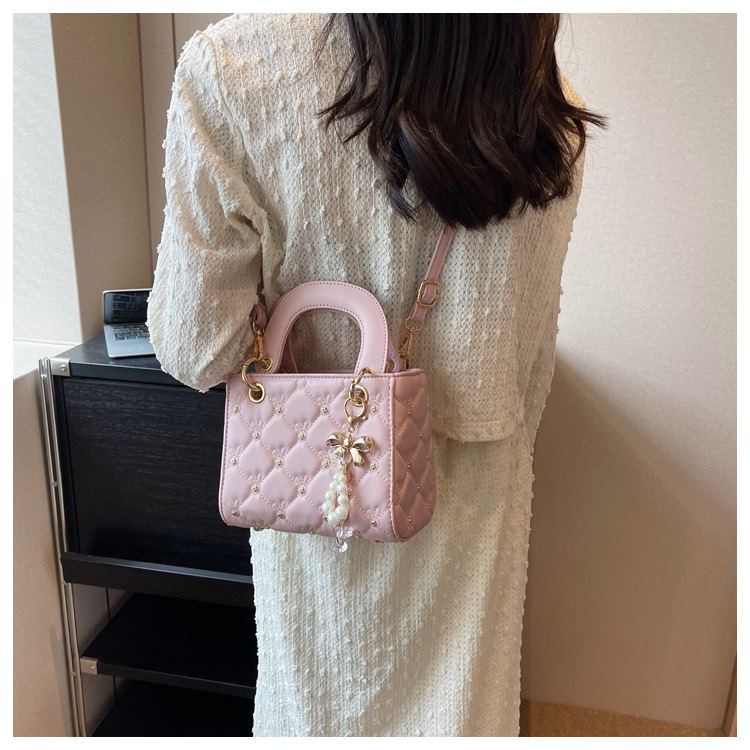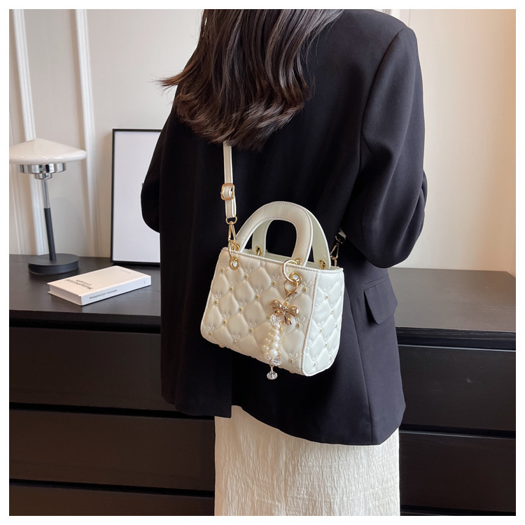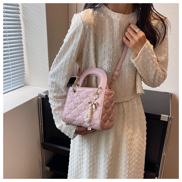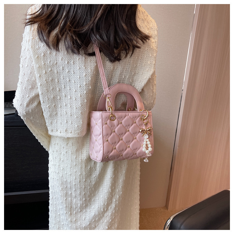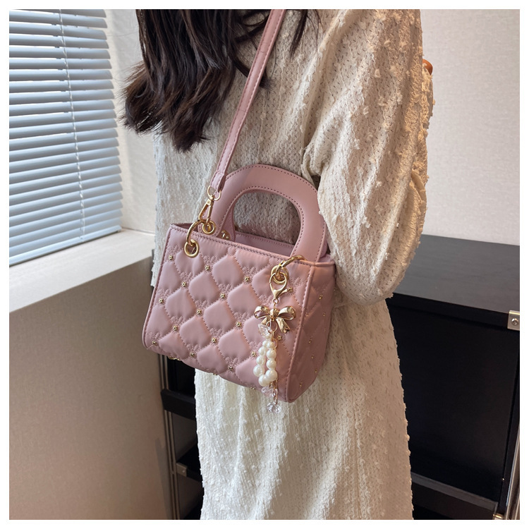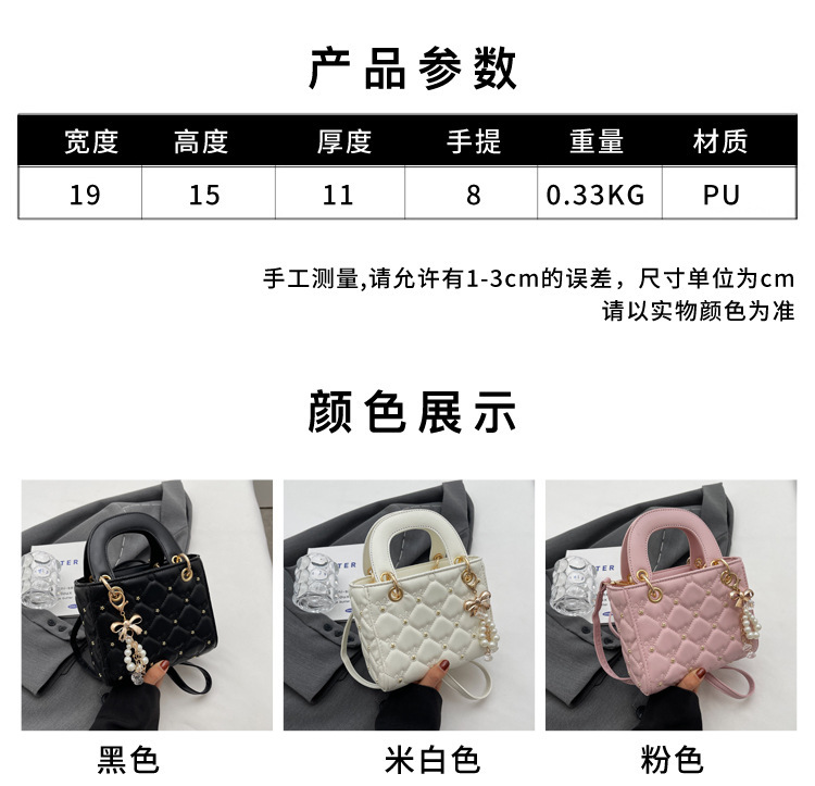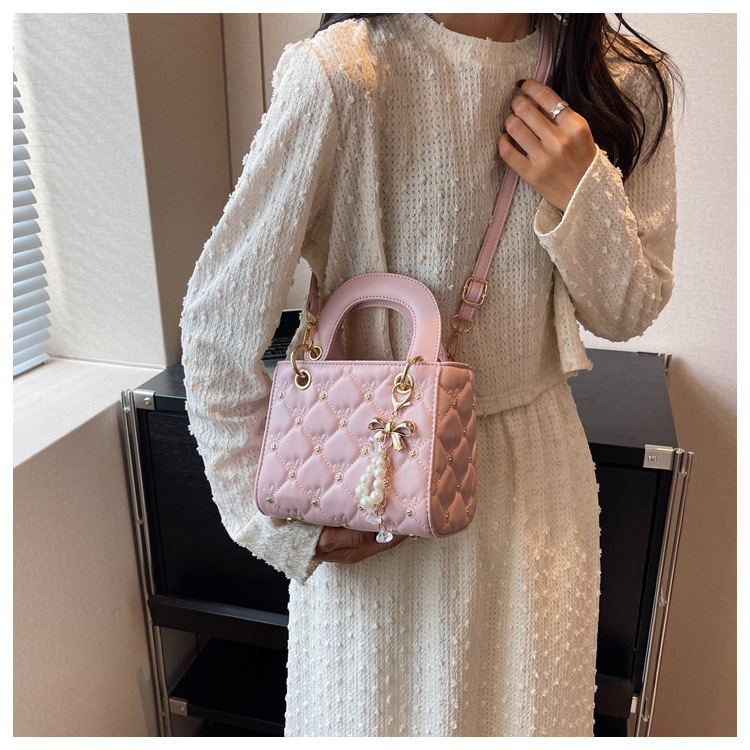 高级感法国洋气小众包包新款潮时尚菱格珍珠手提包单肩斜挎戴妃包