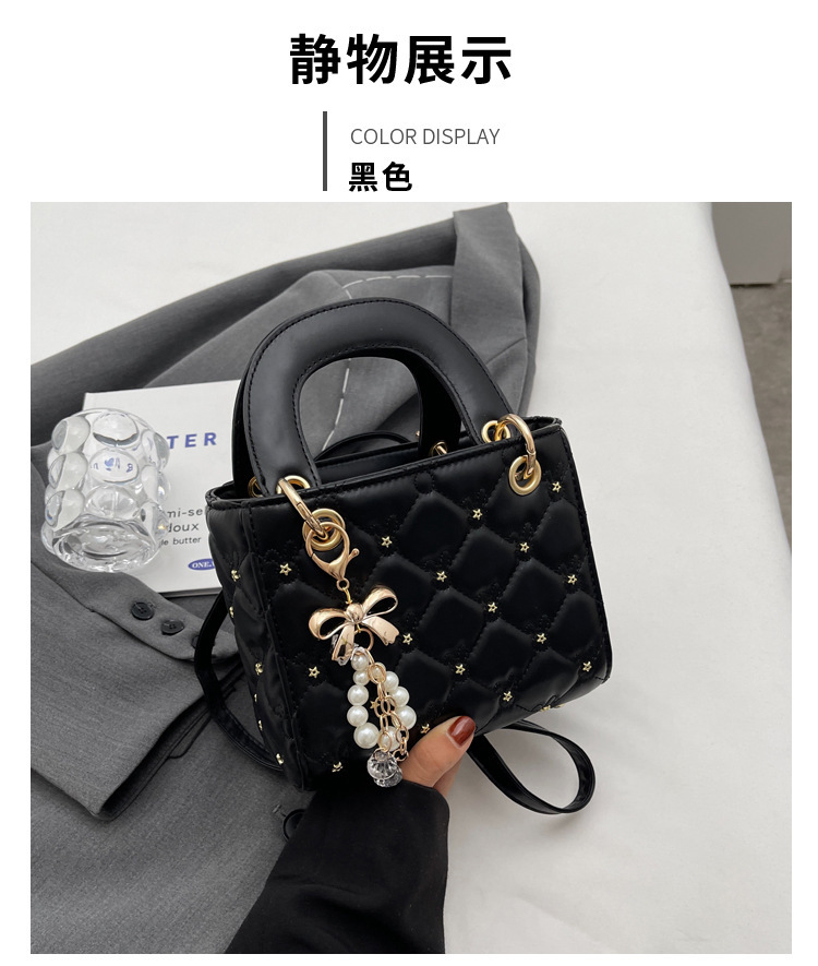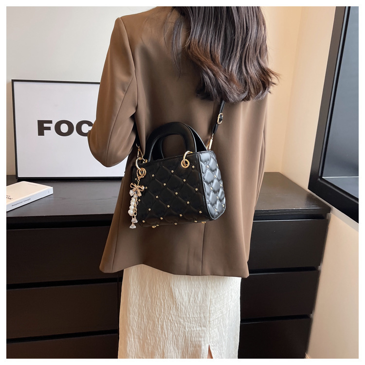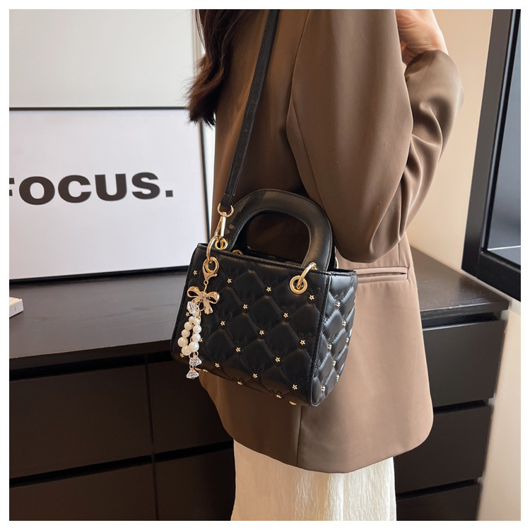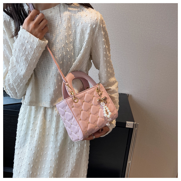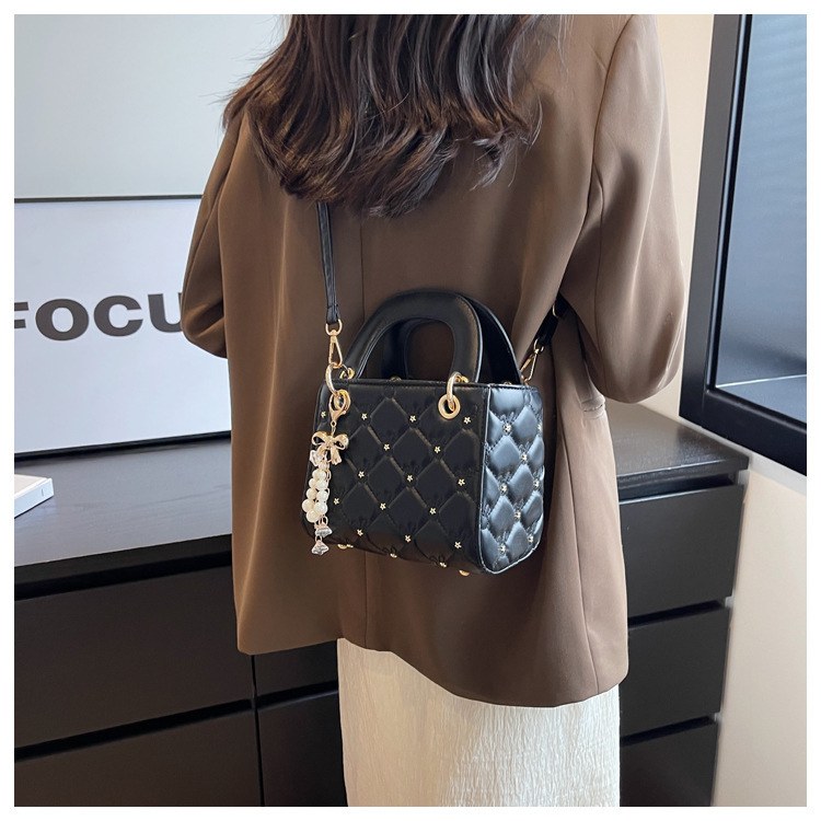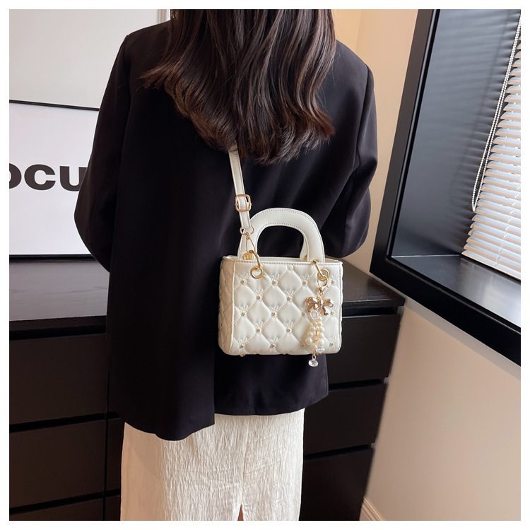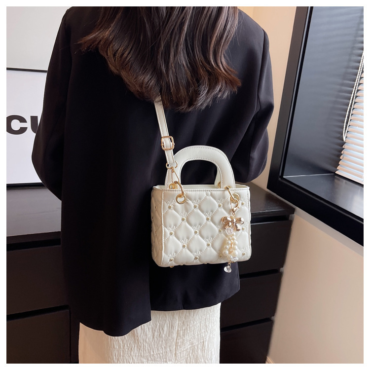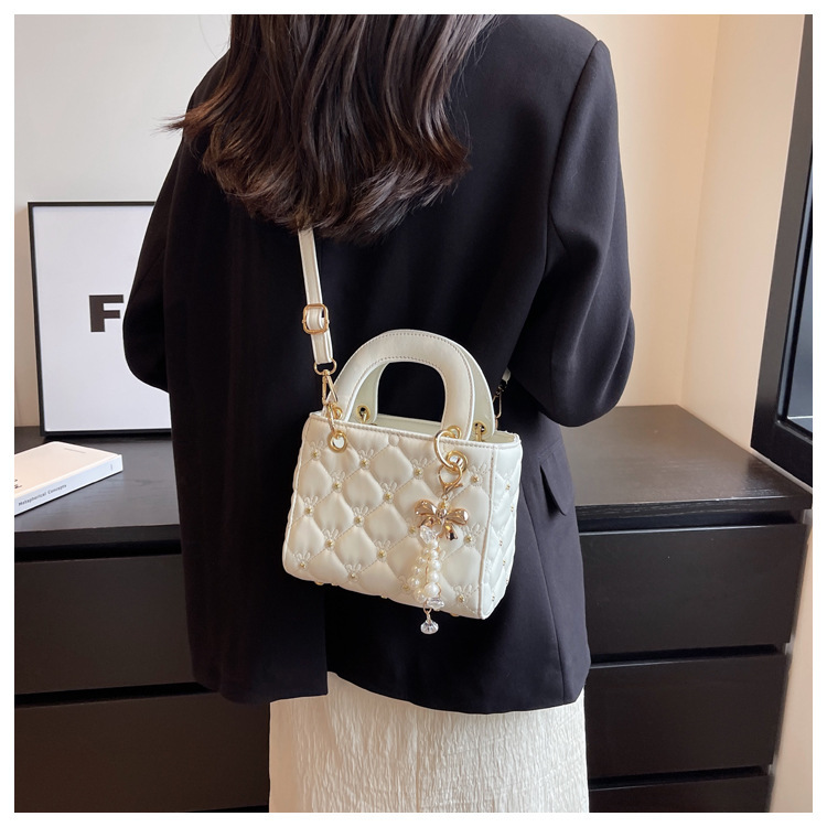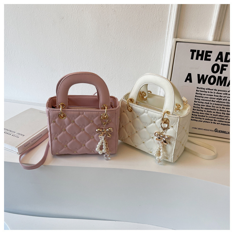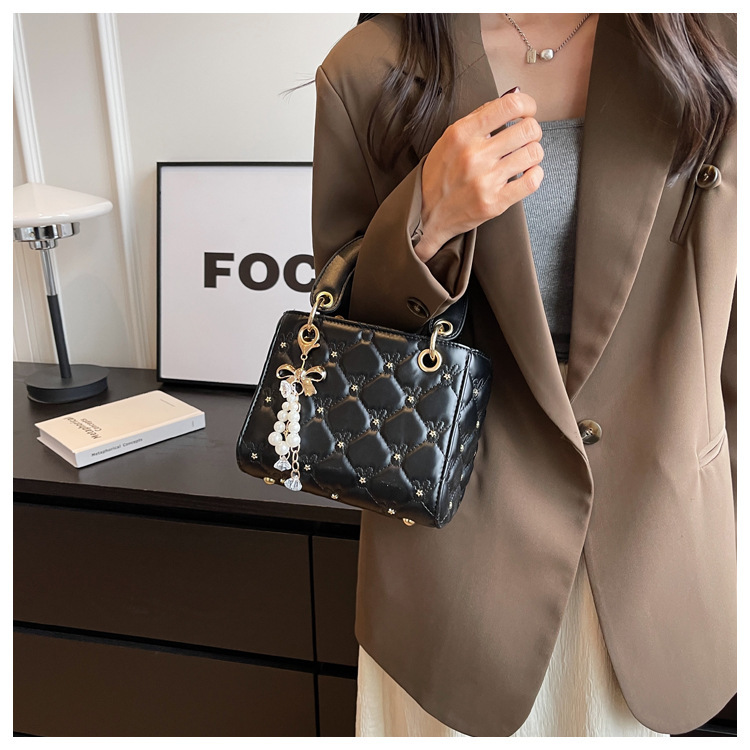 高级感法国洋气小众包包新款潮时尚菱格珍珠手提包单肩斜挎戴妃包