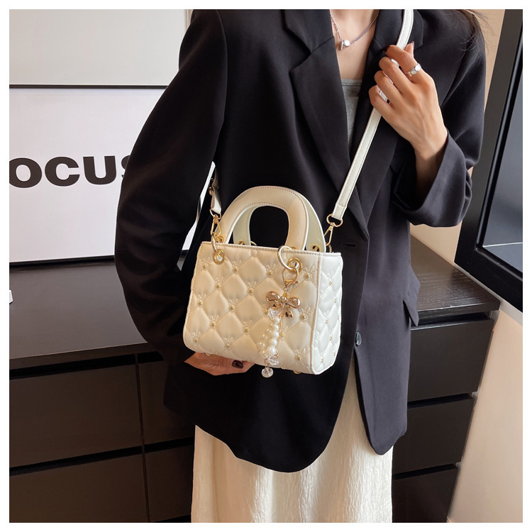 2025春夏の新型戴妃包女性高級感菱格刺繍線真珠手提げバケツバッグシングルショルダーバッグ