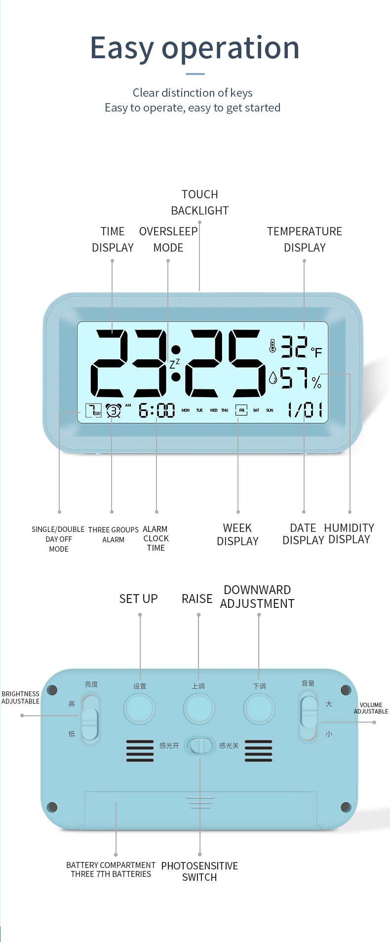 目覚まし時計 学生専用目覚まし時計 起き上がり用スマート光感知小型目覚まし時計 夜光感知温度湿度電子目覚まし時計