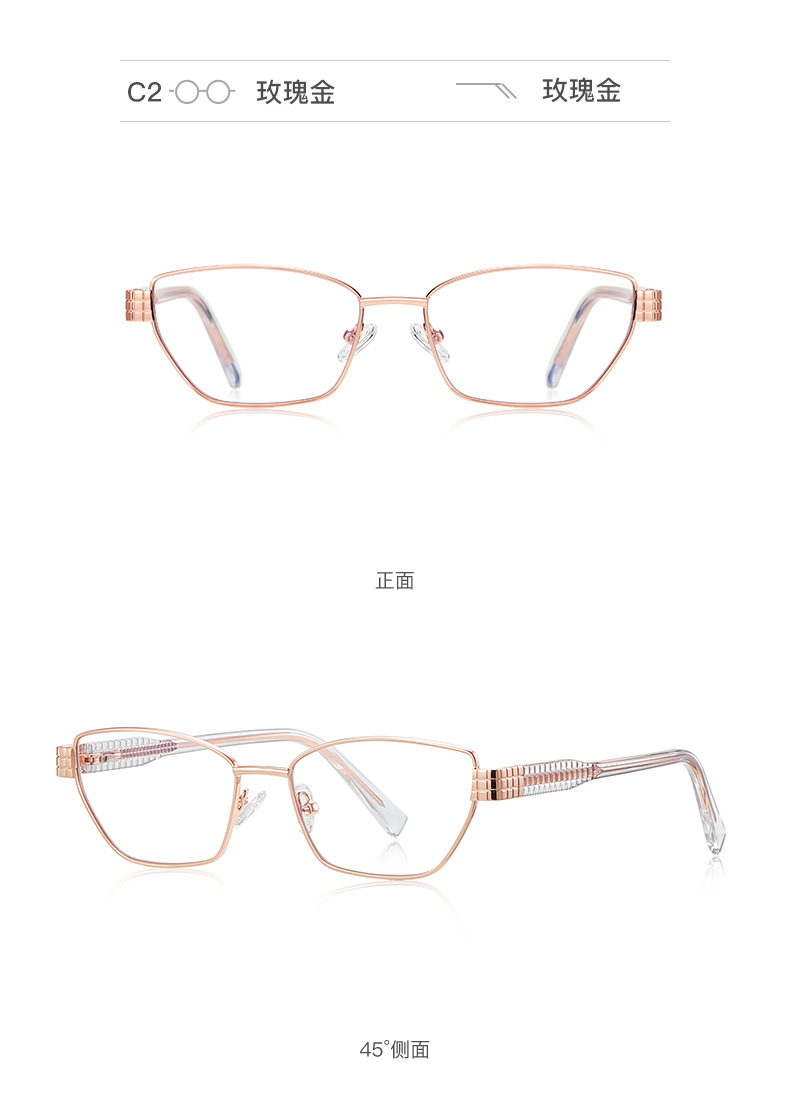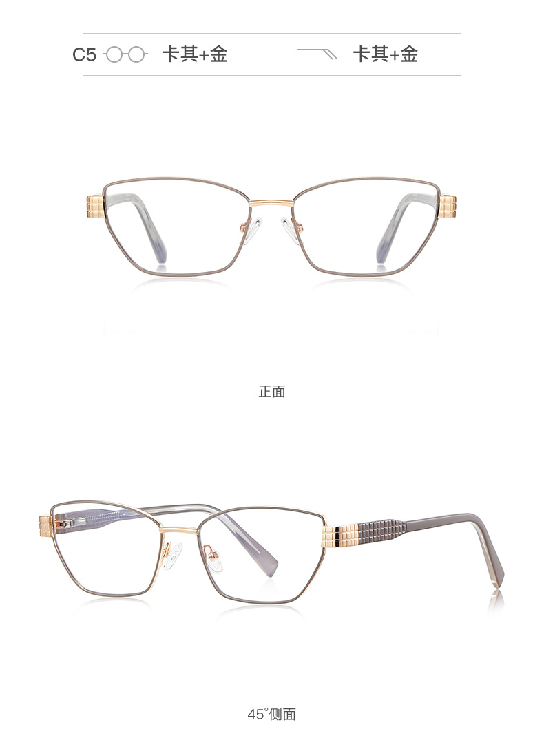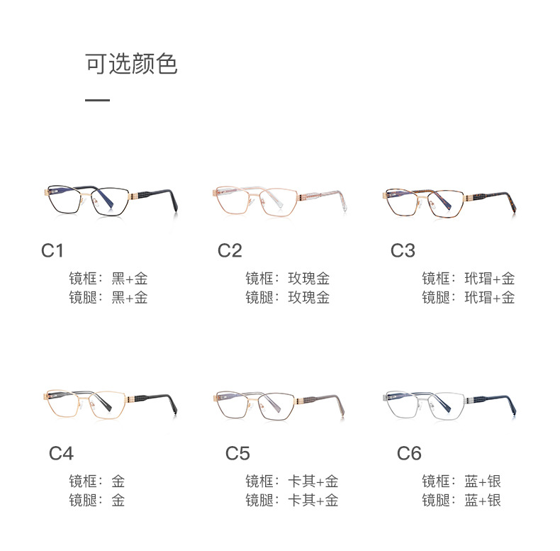 镜框颜色 C1金/亮黑框,C2玫瑰金/透明框,C3金/茶豆花框,C4金/拖面黑框,C5金/实卡其框,C6银/托实蓝框