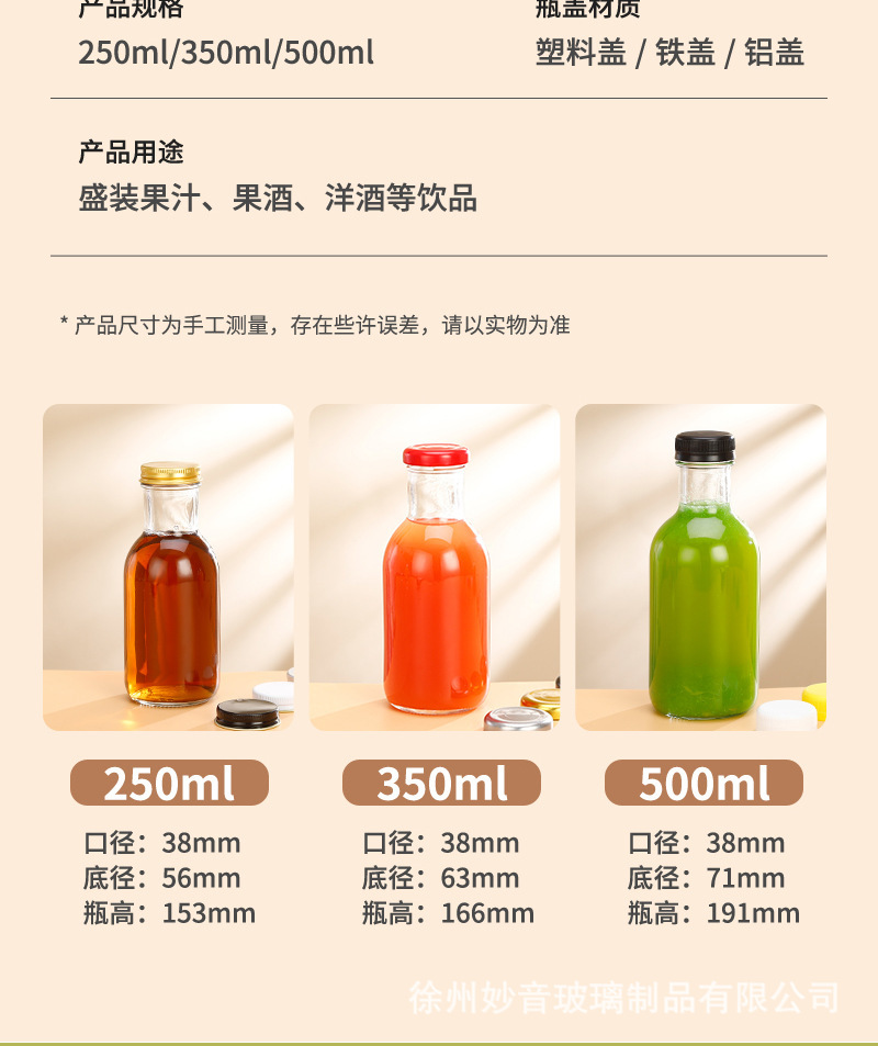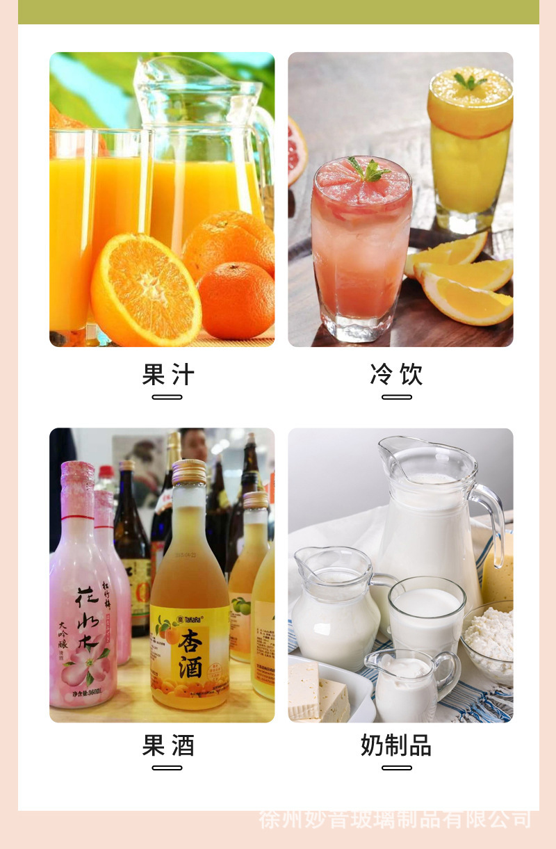 规格型号 250ml沙棘瓶+铝盖;透明,250ml沙棘瓶+铁盖;透明,250ml沙棘瓶+塑料盖;透明,350ml沙棘瓶+铁盖;透明,350ml沙棘瓶+塑料盖;透明,350ml沙棘瓶+塑料防盗盖;透明,500ml沙棘瓶+铁盖;透明,500ml沙棘瓶+塑料盖;透明,500ml沙棘瓶+铝盖;透明,250卡奇诺瓶+铁盖;透明,250卡奇诺瓶+铝盖;透明,250卡奇诺瓶+塑料盖;透明,350ml卡奇诺瓶+铁盖;透明,350ml卡奇诺瓶+塑料防盗白盖;透明,350ml卡奇诺瓶+塑料防盗黄盖;透明,500ml卡奇诺瓶+铁盖;透明,500ml卡奇诺瓶+铝盖;透明,500ml卡奇诺瓶+塑料盖;透明