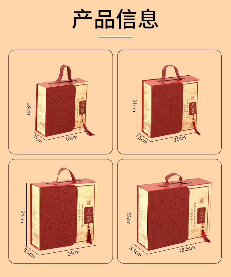 规格型号 红色流苏(金榜题名);小号:18*18*7cm,红色流苏(金榜题名);中号:21*21*7.5cm,红色流苏(金榜题名);大号:24*24*8.5cm,红色流苏(金榜题名);特大号:28*23*8.5cm,红色流苏(喜事);小号:18*18*7cm,红色流苏(喜事);中号:21*21*7.5cm,红色流苏(喜事);大号:24*24*8.5cm,红色流苏(喜事);特大号:28*23*8.5cm