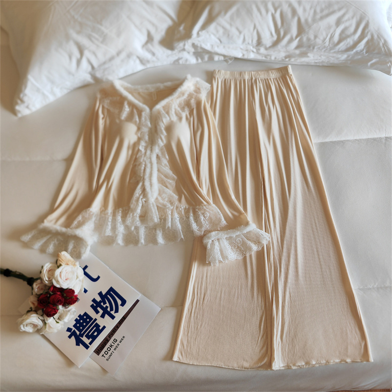 莫代尔睡衣女春秋季长袖带胸垫一体甜美公主风可外穿家居服两件套