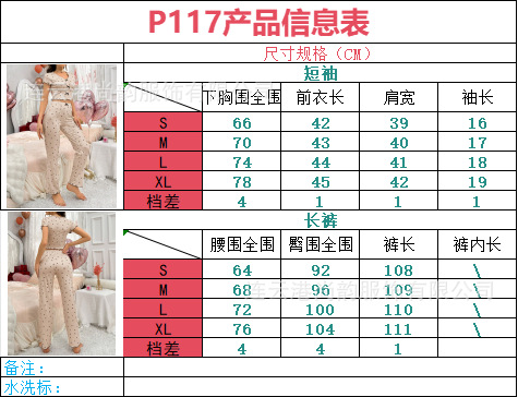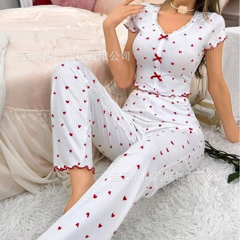 跨境欧美热销家居服印花爱心V领短袖睡衣女可外穿长裤两件套套装