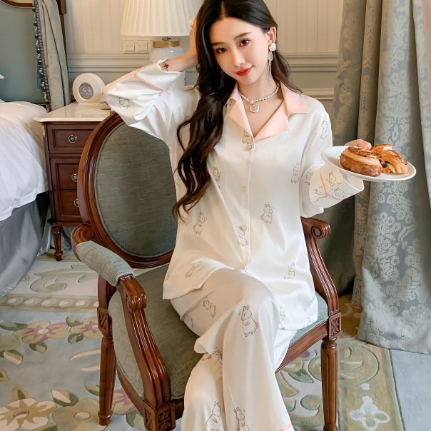 春夏新作アイスパジャマ女性可愛いラッキーウサギ軽豪華高級感カジュアル長袖長ズボンホームウェアセット