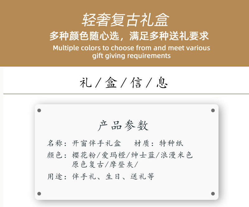 规格型号 盒子-米白色;裸盒(不带任何装饰),盒子-米白色;拉菲草(一盒)(不带盒子),盒子-米白色;吊牌+丝带 (不带盒子),盒子-米白色;透明手提袋(不带盒子),盒子-蓝色;裸盒(不带任何装饰),盒子-蓝色;拉菲草(一盒)(不带盒子),盒子-蓝色;吊牌+丝带 (不带盒子),盒子-蓝色;透明手提袋(不带盒子),盒子-酒红色;裸盒(不带任何装饰),盒子-酒红色;拉菲草(一盒)(不带盒子),盒子-酒红色;吊牌+丝带 (不带盒子),盒子-酒红色;透明手提袋(不带盒子),盒子-原木色;裸盒(不带任何装饰),盒子-原木色;拉菲草(一盒)(不带盒子),盒子-原木色;吊牌+丝带 (不带盒子),盒子-原木色;透明手提袋(不带盒子)