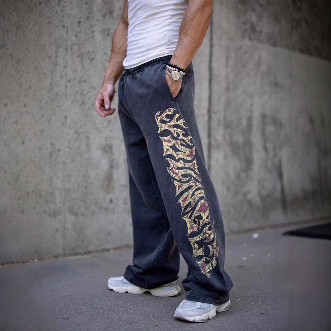 外贸潮牌YOUNGLA健身长裤男士运动裤美式复古长裤街头印花直筒裤
