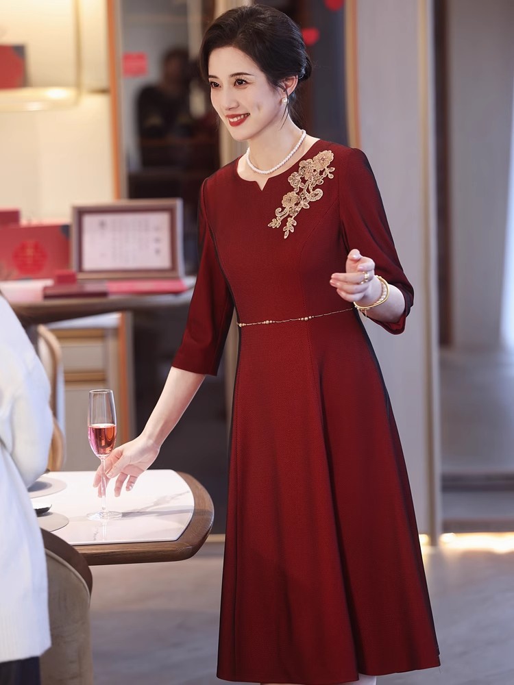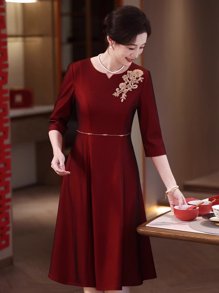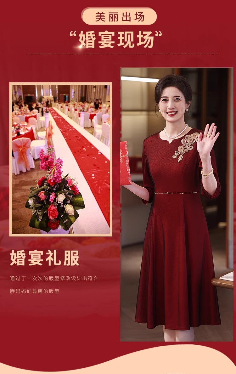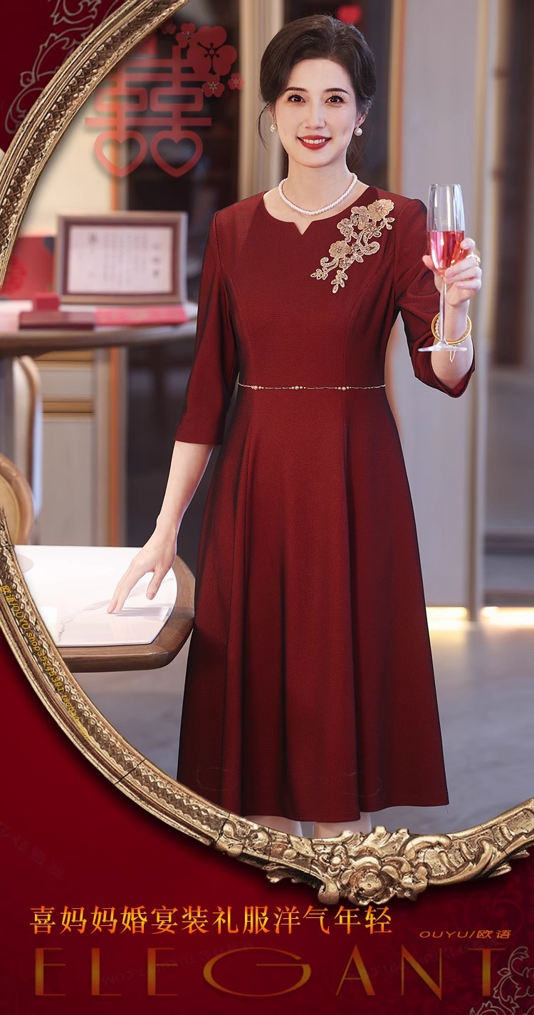 yhfs7941喜婆婆婚宴装酒红色礼服裙2025夏季洋气年轻妈妈装连衣裙