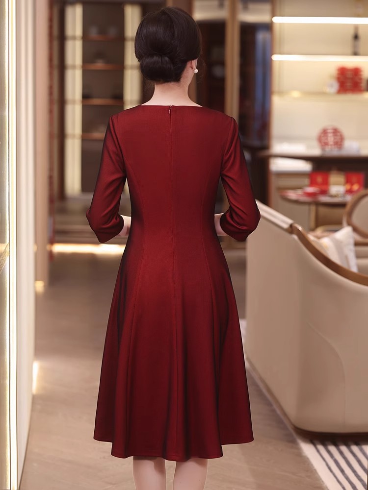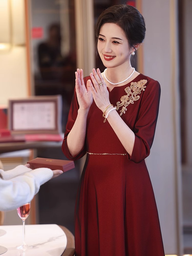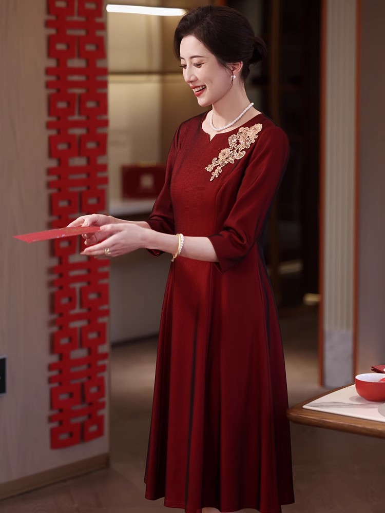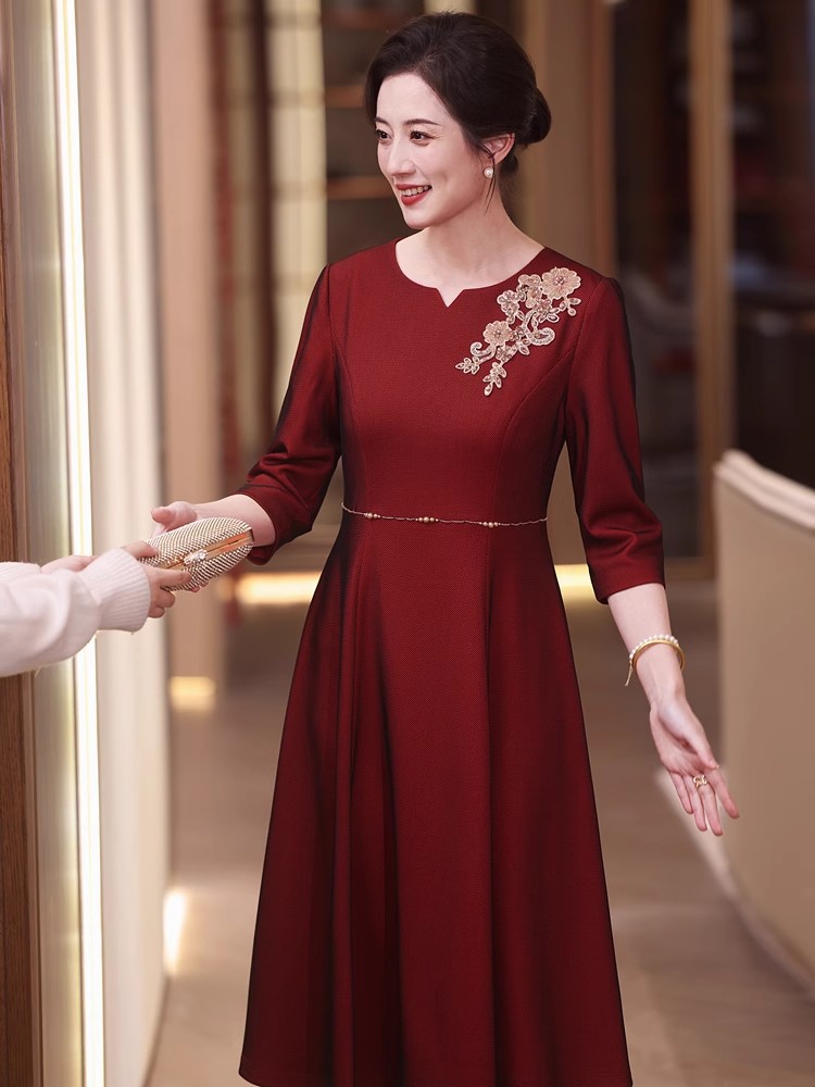 yhfs7941喜婆婆婚宴装酒红色礼服裙2025夏季洋气年轻妈妈装连衣裙