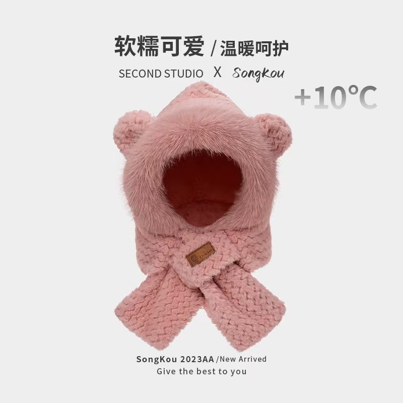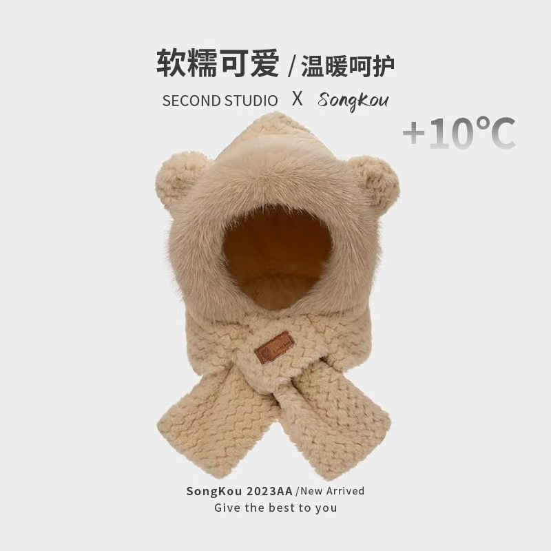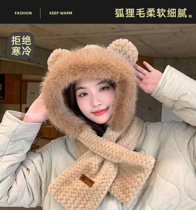 毛绒小熊帽子女围巾一体加绒围脖毛绒帽冬百搭防寒骑行保暖护耳帽