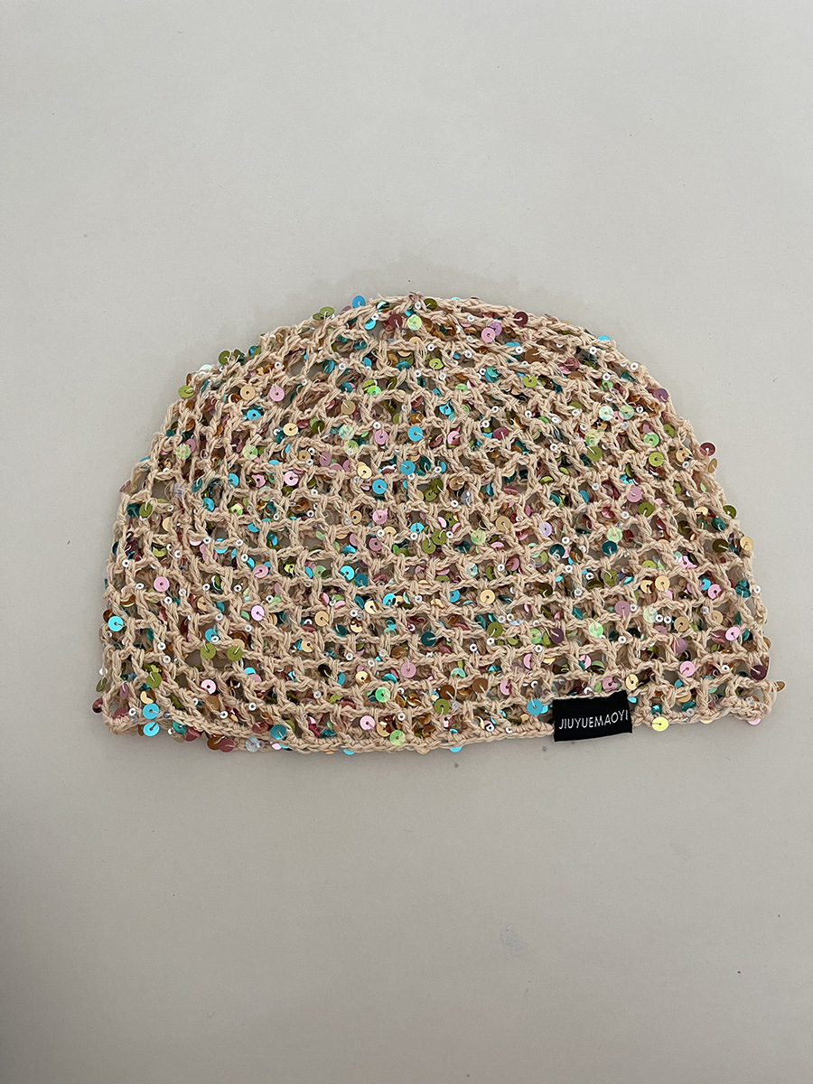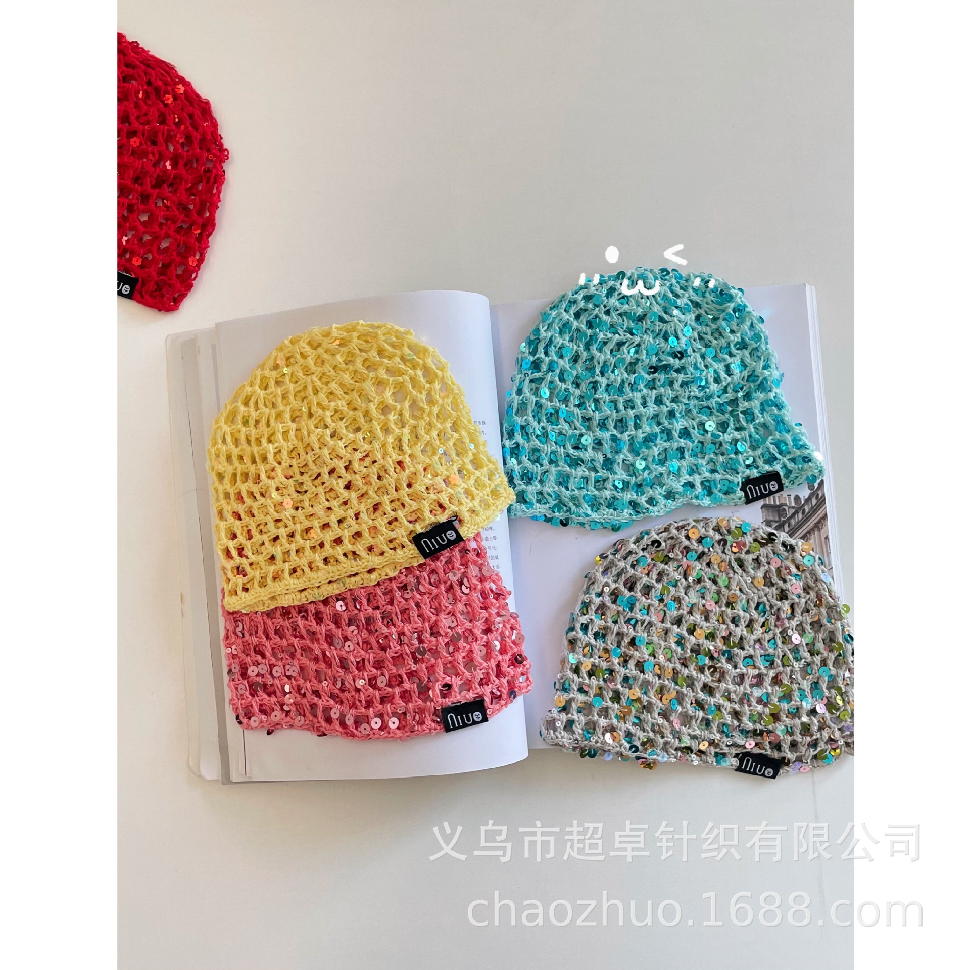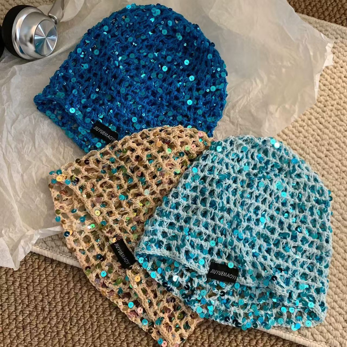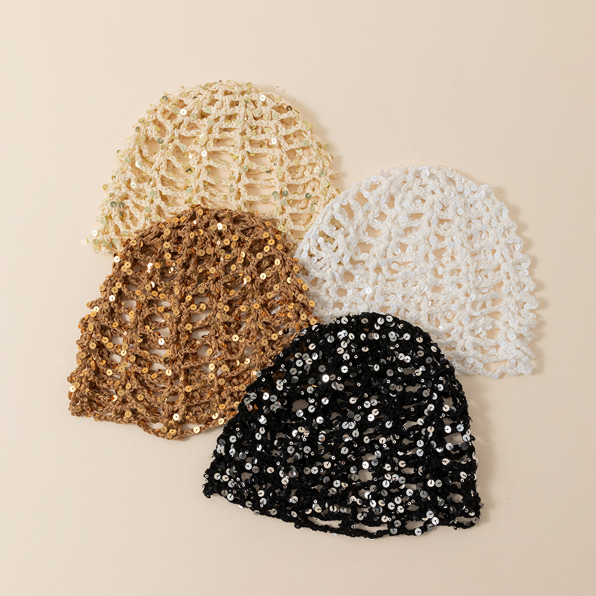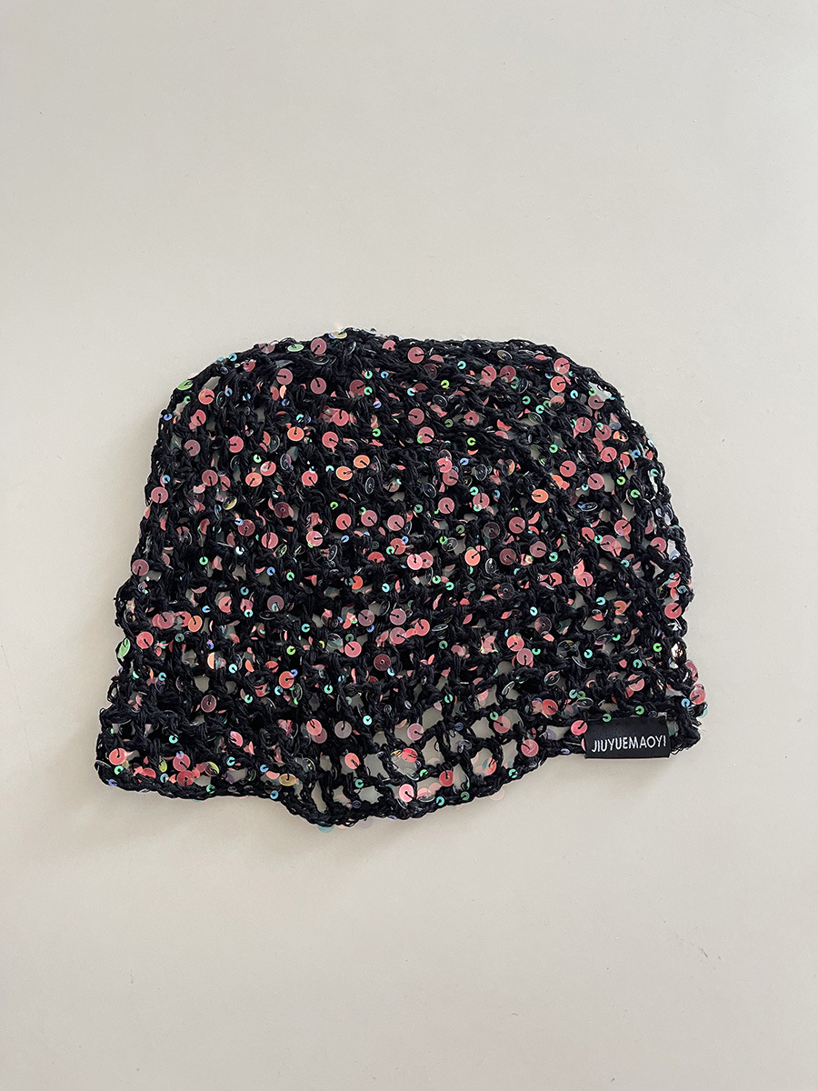 初秋新款民族风亮片镂空针织套头帽女孩洋气时尚凹造型渔网包头帽