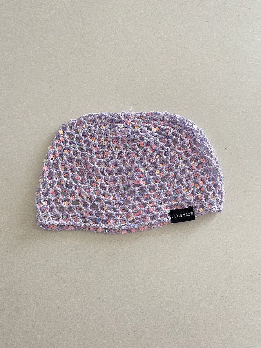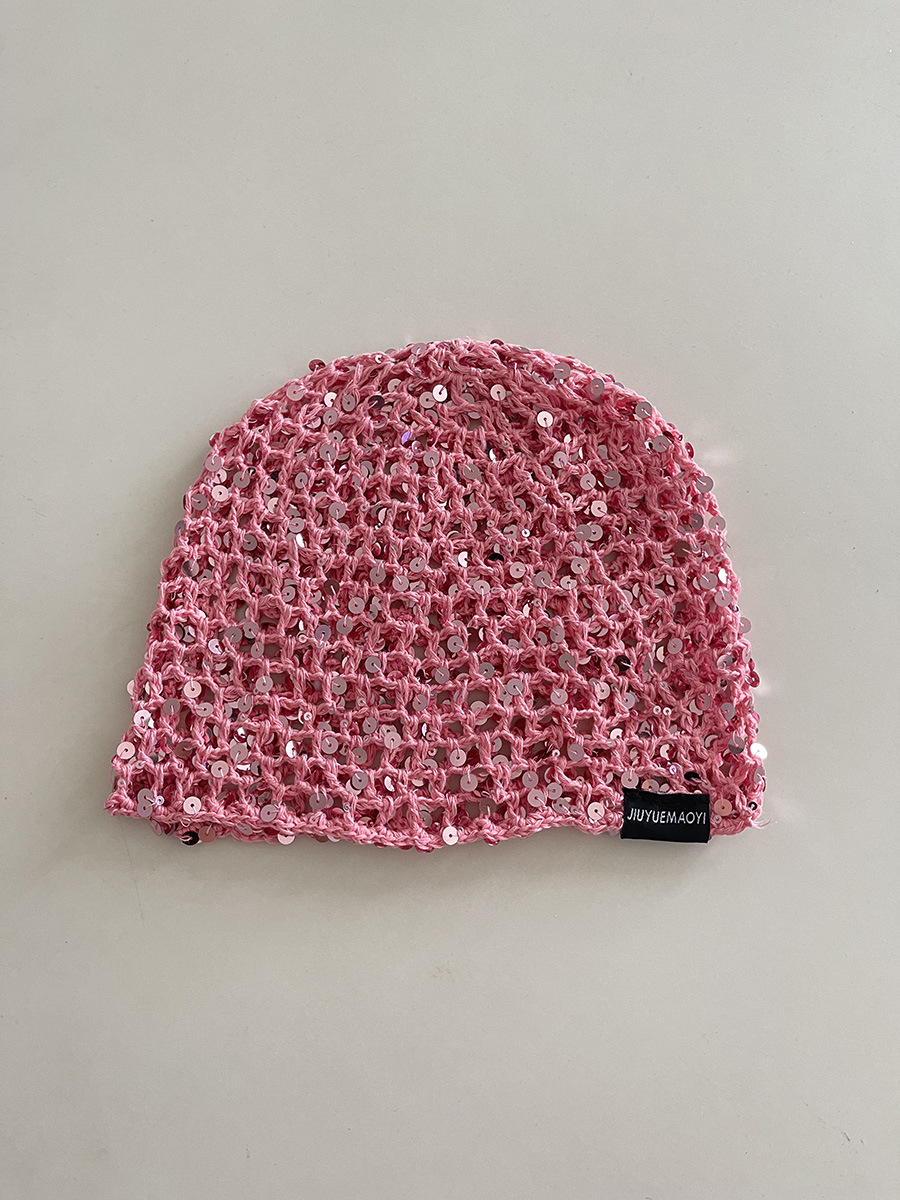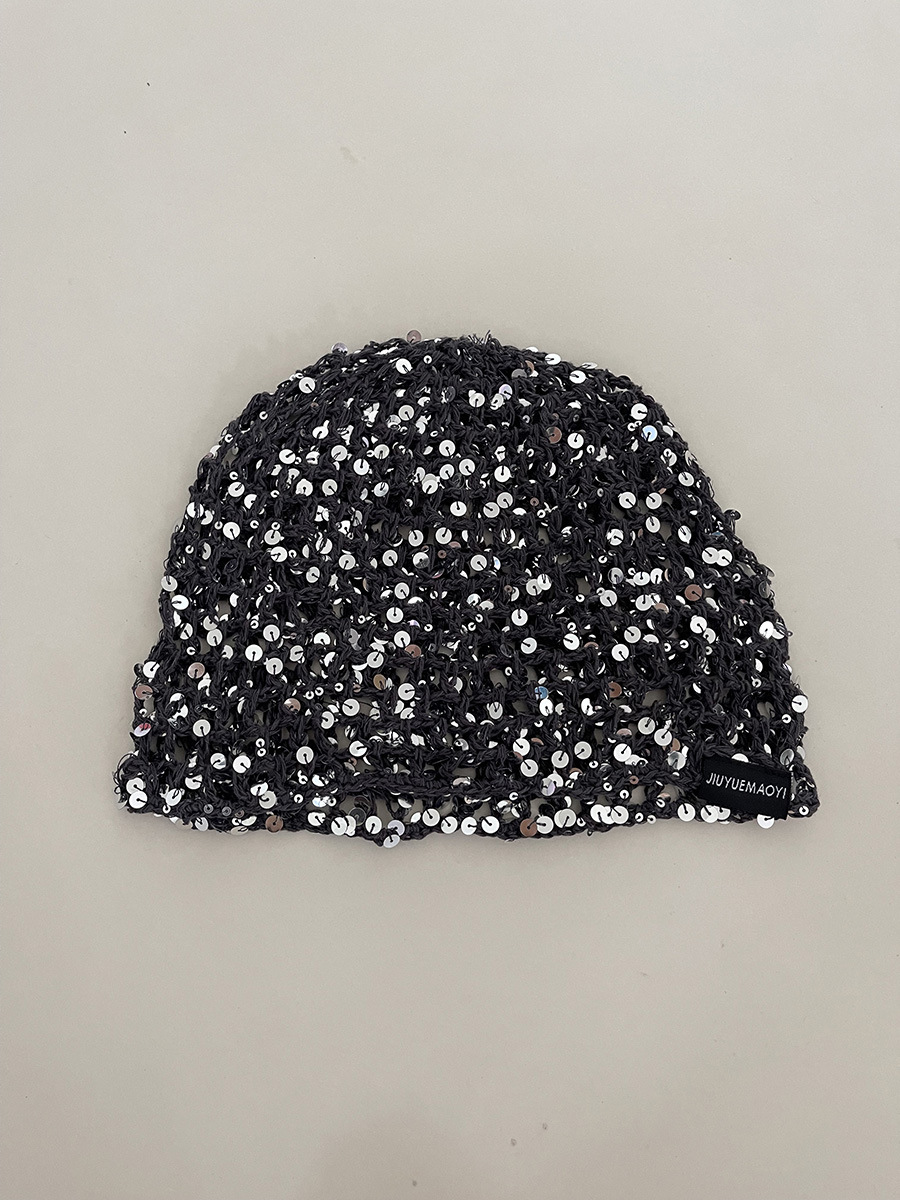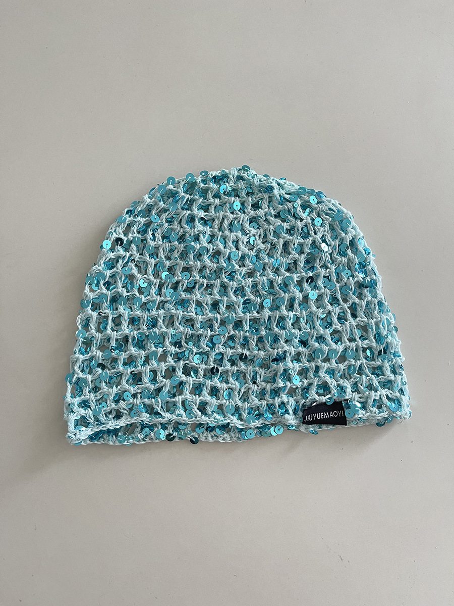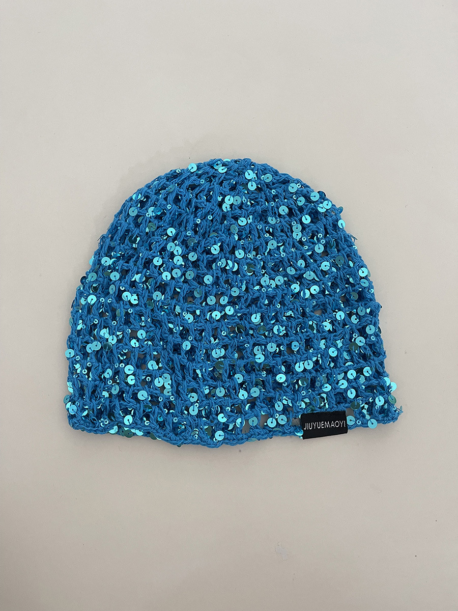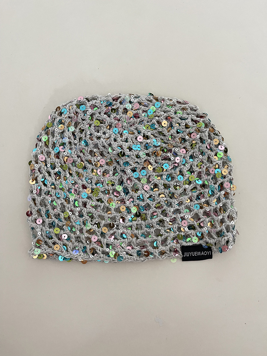 初秋新款民族风亮片镂空针织套头帽女孩洋气时尚凹造型渔网包头帽