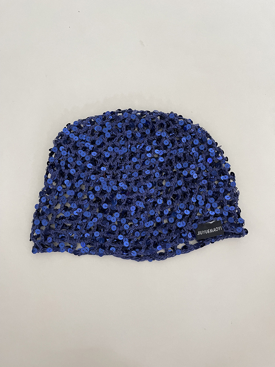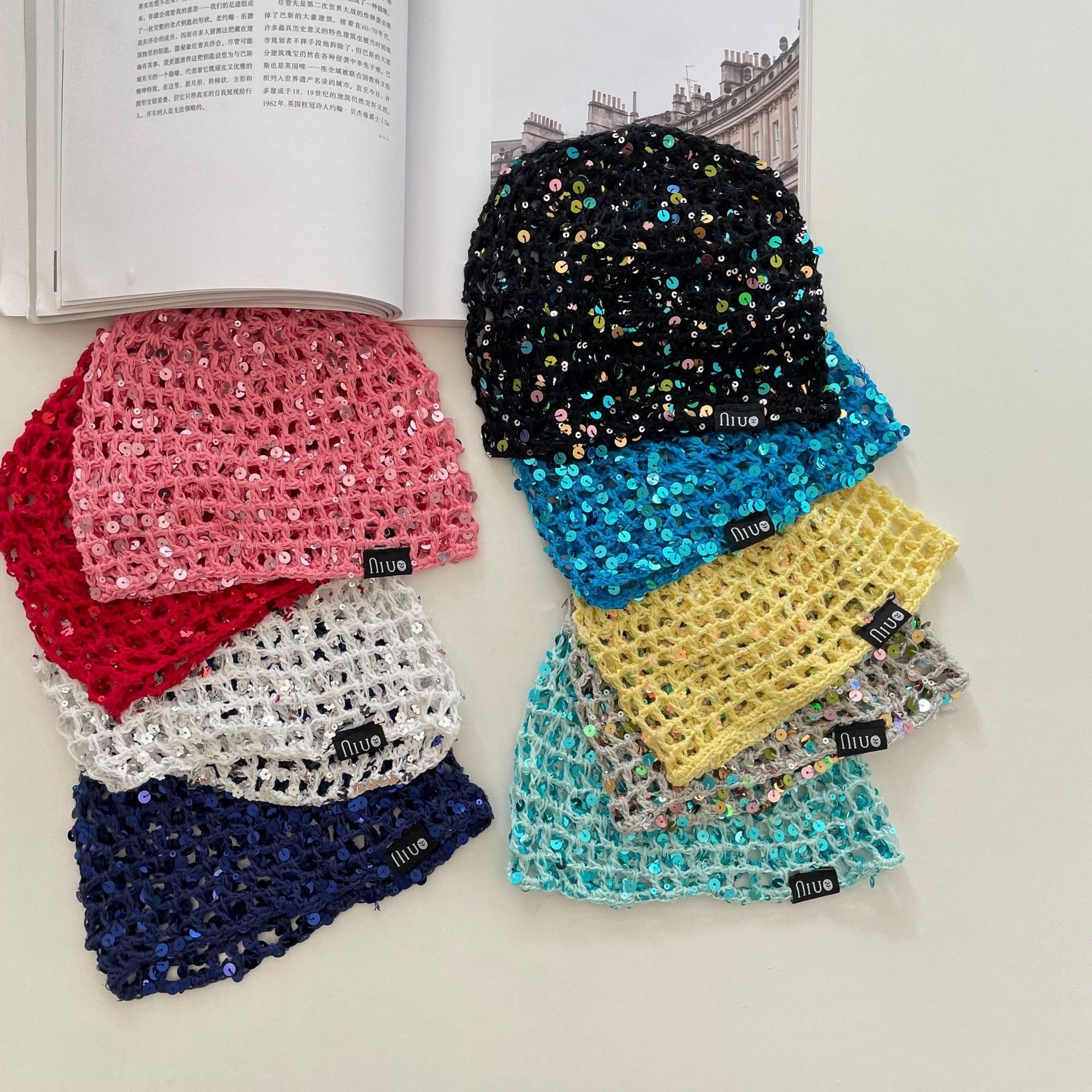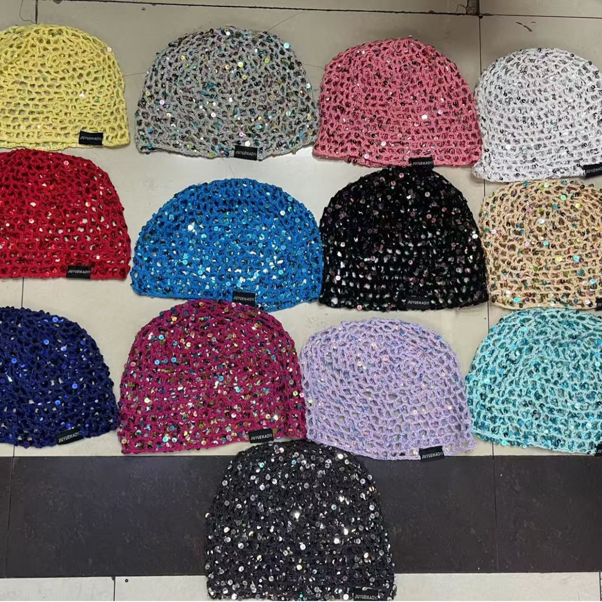 韩系ins彩色亮片珍珠包头帽女时髦复古渔网帽街头个性套头冷帽潮