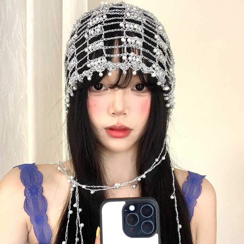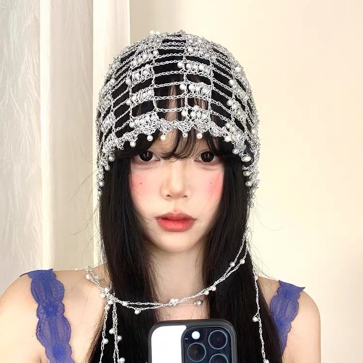 手工银链珍珠流苏镂空帽子女小众设计感显脸小包头帽百搭套头帽子