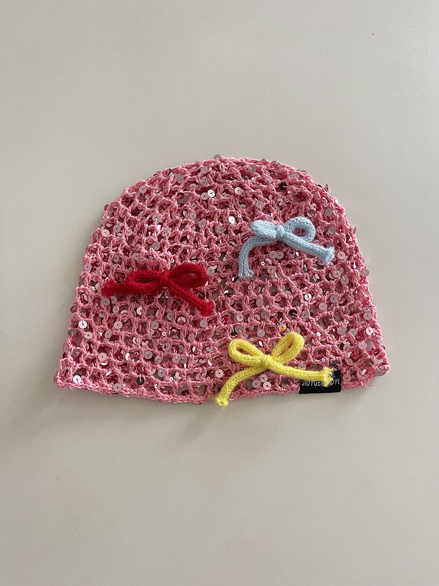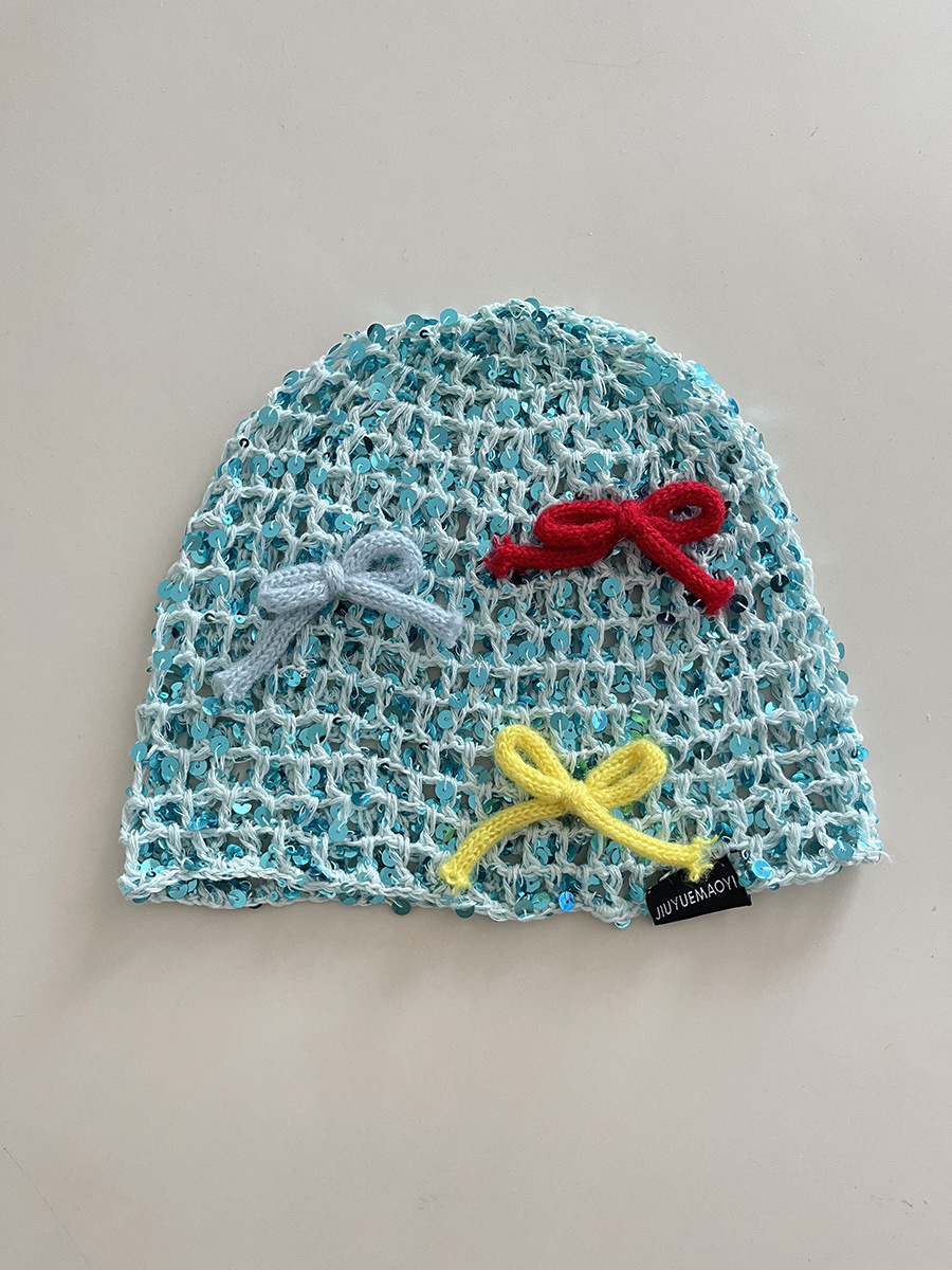 韩国ins亮片蝴蝶结针织包头帽子女新款辣妹时尚渔网帽套头毛线帽