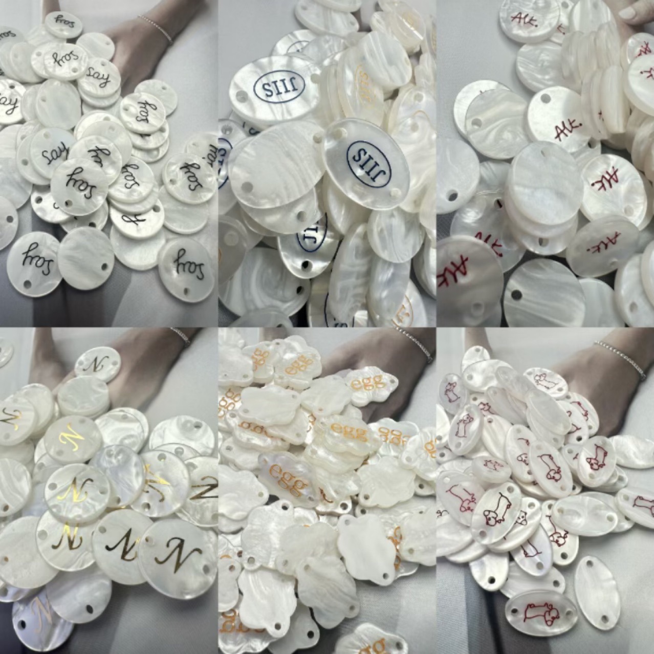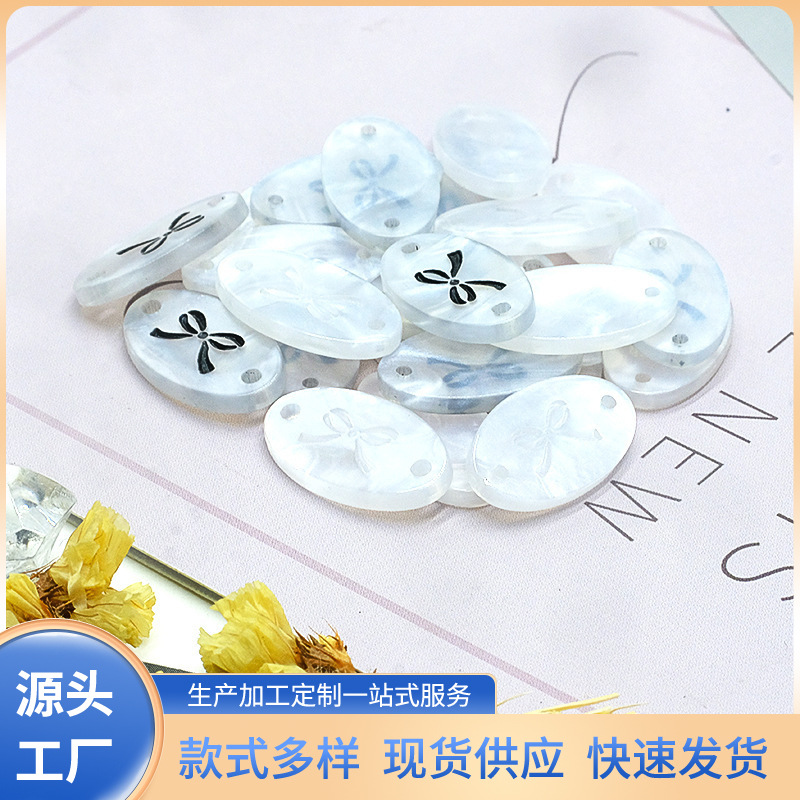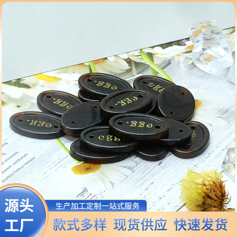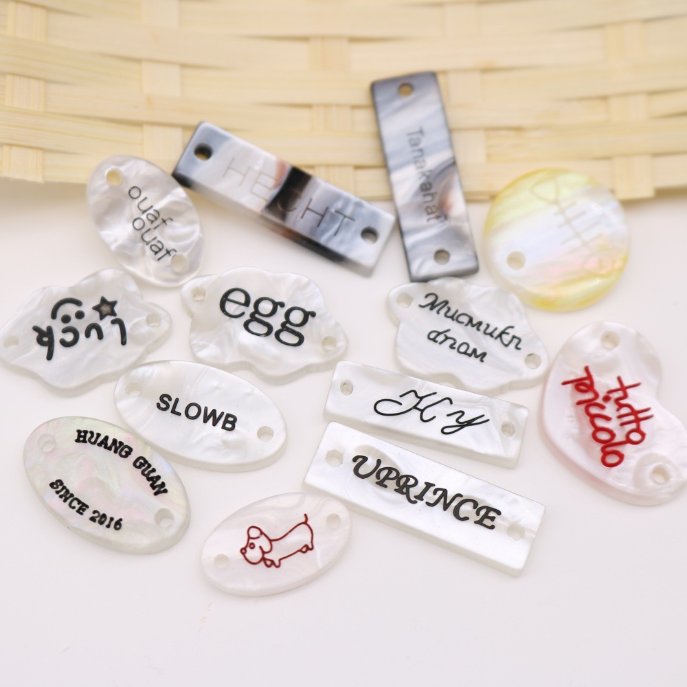 36種類の新商品、在庫あり、貝殻風樹脂製のブランドタグ、文字入り楕円形、蝶型衣料品ラベル、高級で汎用性の高い装飾ボタン