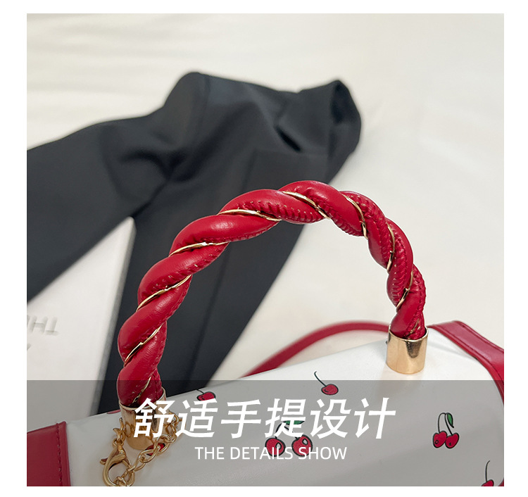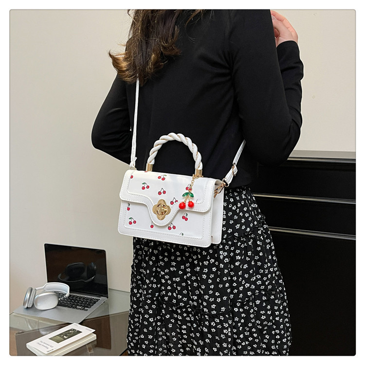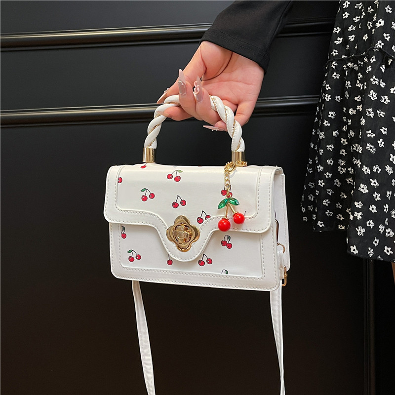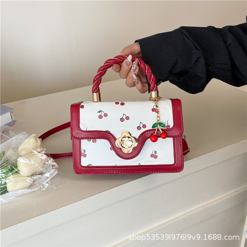 新款樱桃早秋2025潮流清新撞色印花甜美麻花单肩斜挎手提小方包包
