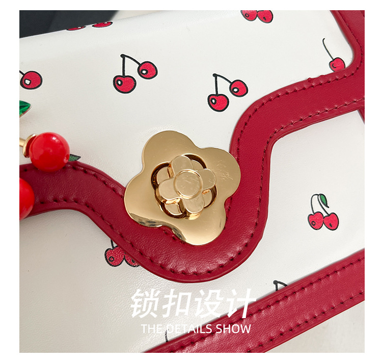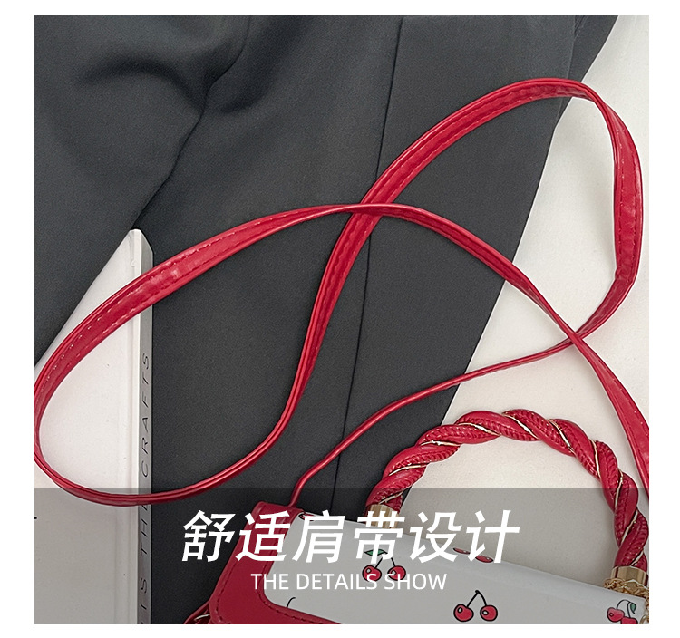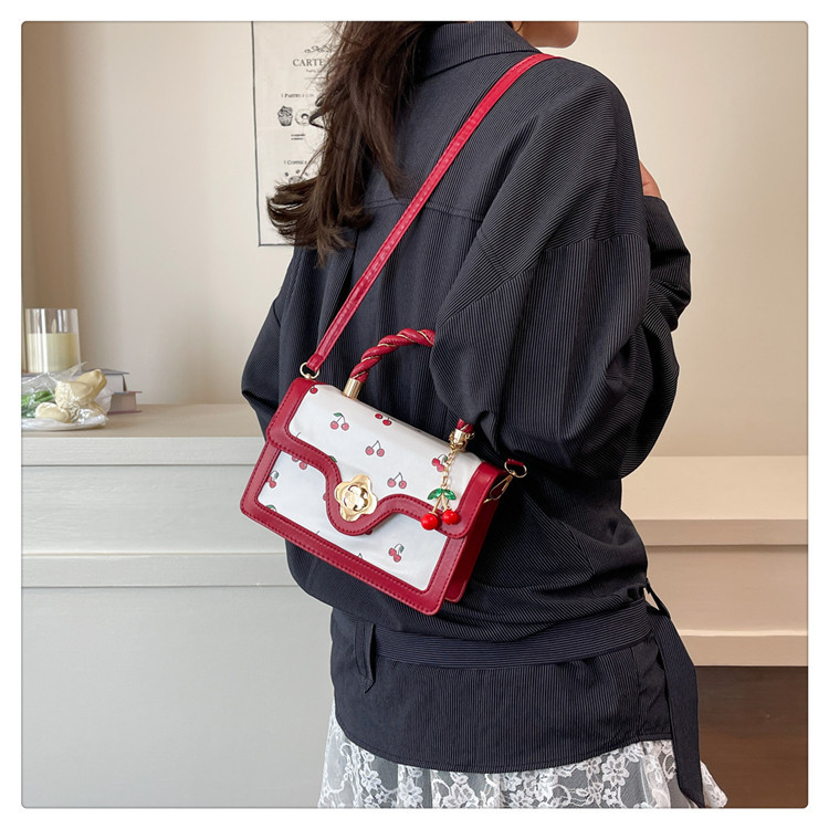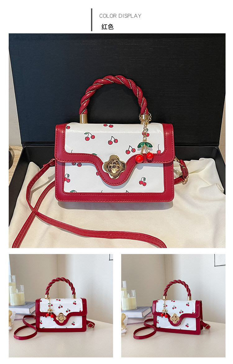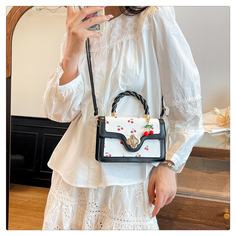 2025新款可爱樱桃印花斜挎包麻花手提小方包拼接撞色设计单肩包潮