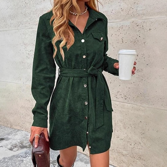 欧美跨境外贸女装优雅气质袋盖腰带工装风灯芯绒衬衫裙连衣裙短裙