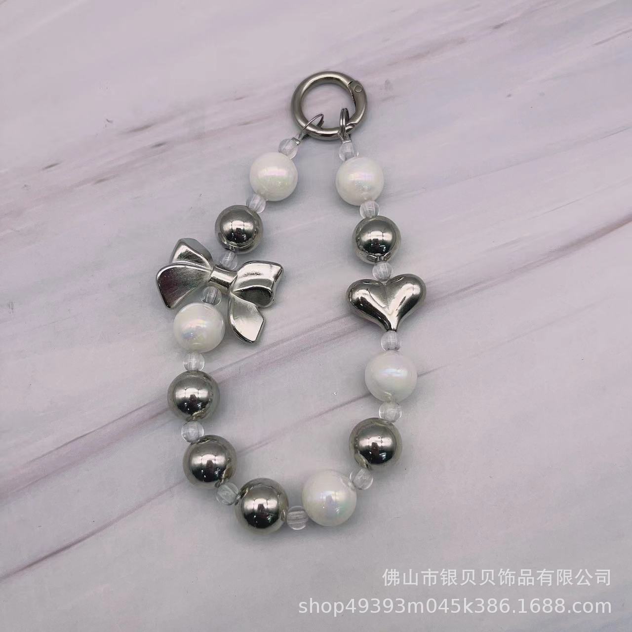 2025年新作 ビーズハートリボン付きスマホケースチェーン キュートなキャンディーカラー キーホルダー アクセサリー バッグ飾り