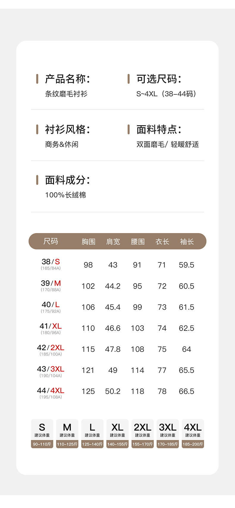 尺码 38/165/S (建议90-110斤),39/170/M (建议110-125斤),40/175/L(建议125-140斤),41/180/XL (建议140-155斤),42/185/XXL(建议155-170斤),43/190/XXXL (建议170-185斤),44/195/XXXXL (建议185-200斤)
