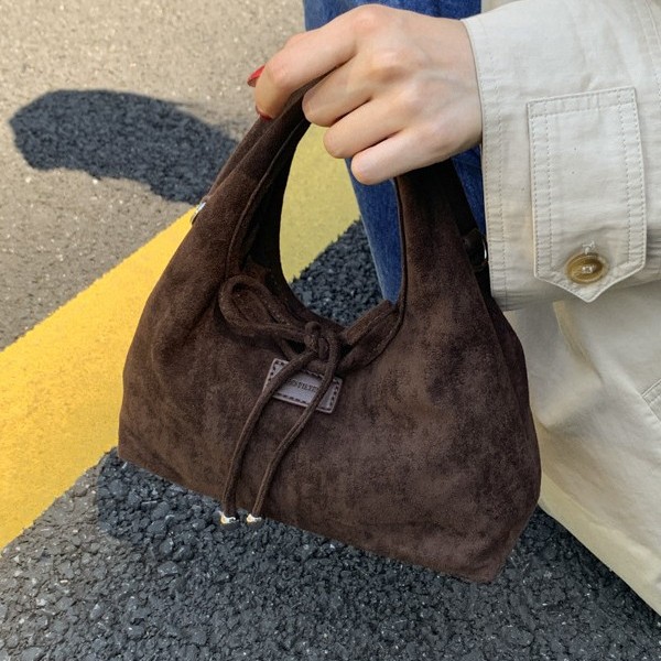 韩版麂皮绒蝴蝶结托特包女2025秋冬新款大容量百搭单肩斜挎水桶包