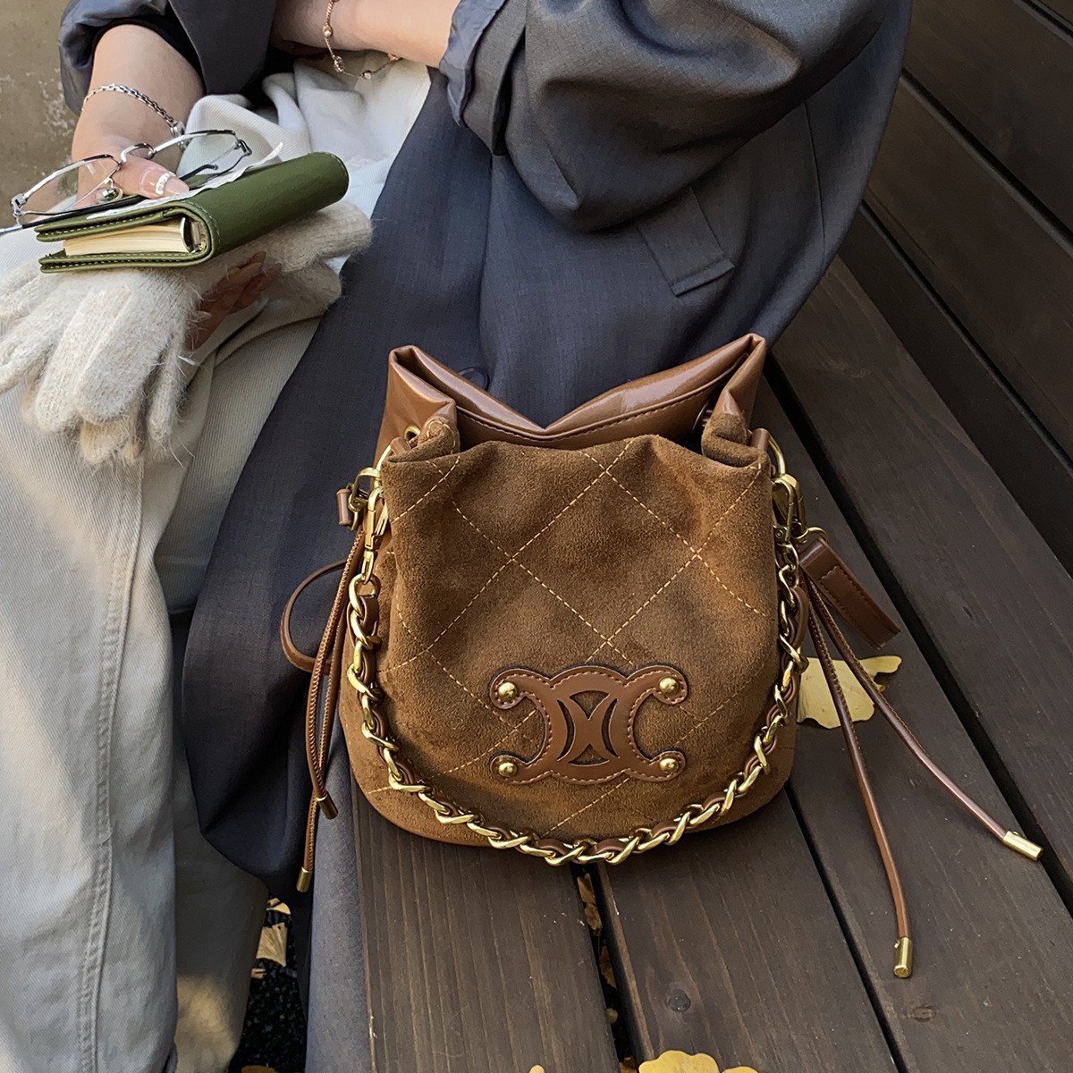 韩版复古磨砂皮水桶包女2025秋冬新款单肩斜挎包菱格纹链条手提包