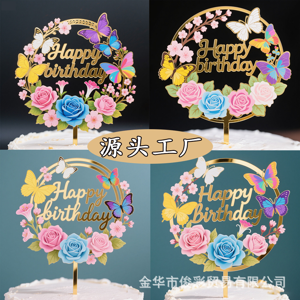新款彩印生日蛋糕插牌网红亚克力浅色花朵happy birthday蛋糕装饰