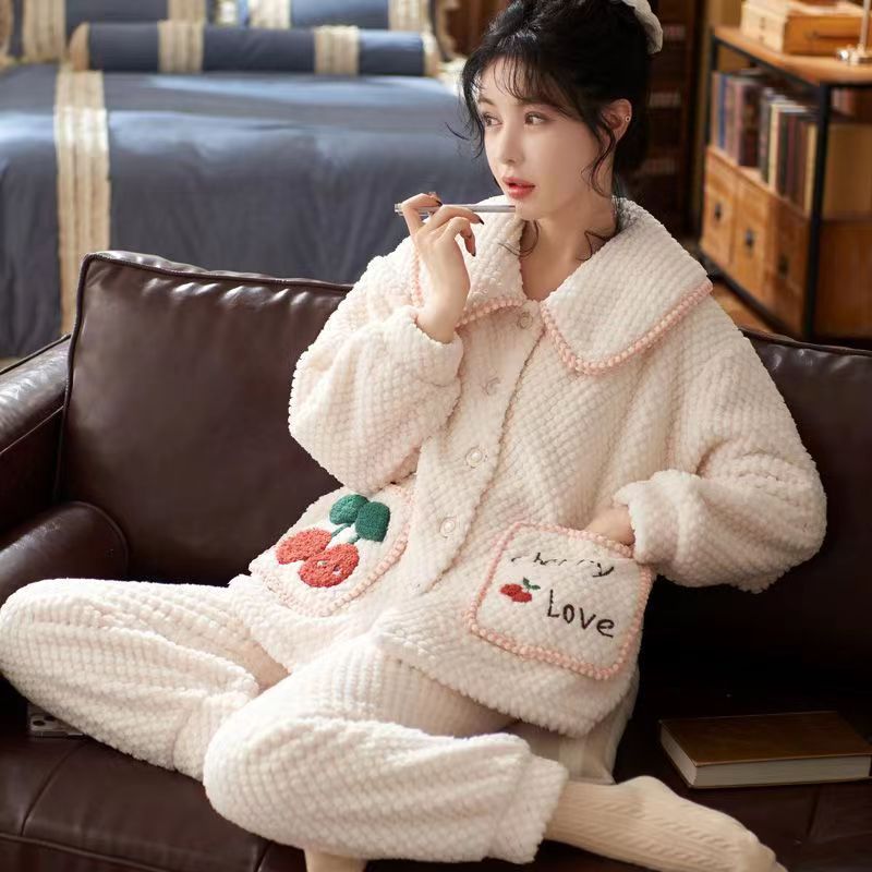 珊瑚ベルベットパジャマ レディース 秋冬 裏起毛 厚手 学生 カジュアル 外出着 ホームウェアセット 厚手 暖かい