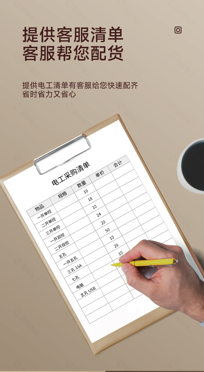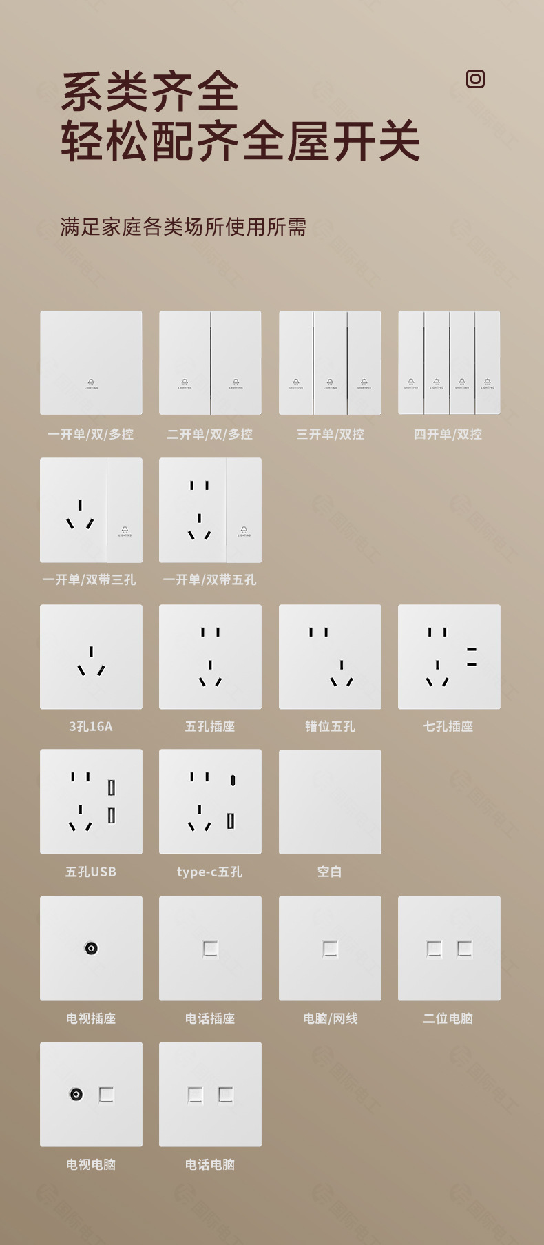 型号 五孔,错位五孔,大功率五孔(电磁炉、烤箱推荐),一开单控,一开双控,一开多控,二开单控,二开双控,二开多控,三开单控,三开双控,三开多控(1个多控+2个双控按键),四开单控,四开双控,16A空调三孔,七孔,一开16A双控,一开五孔单控,一开五孔双控,电视,电脑(超五类),电脑(六类),电视电脑,电视电脑(六类),双电脑,双电脑(六类),白板,暗盒修复器(10只装)