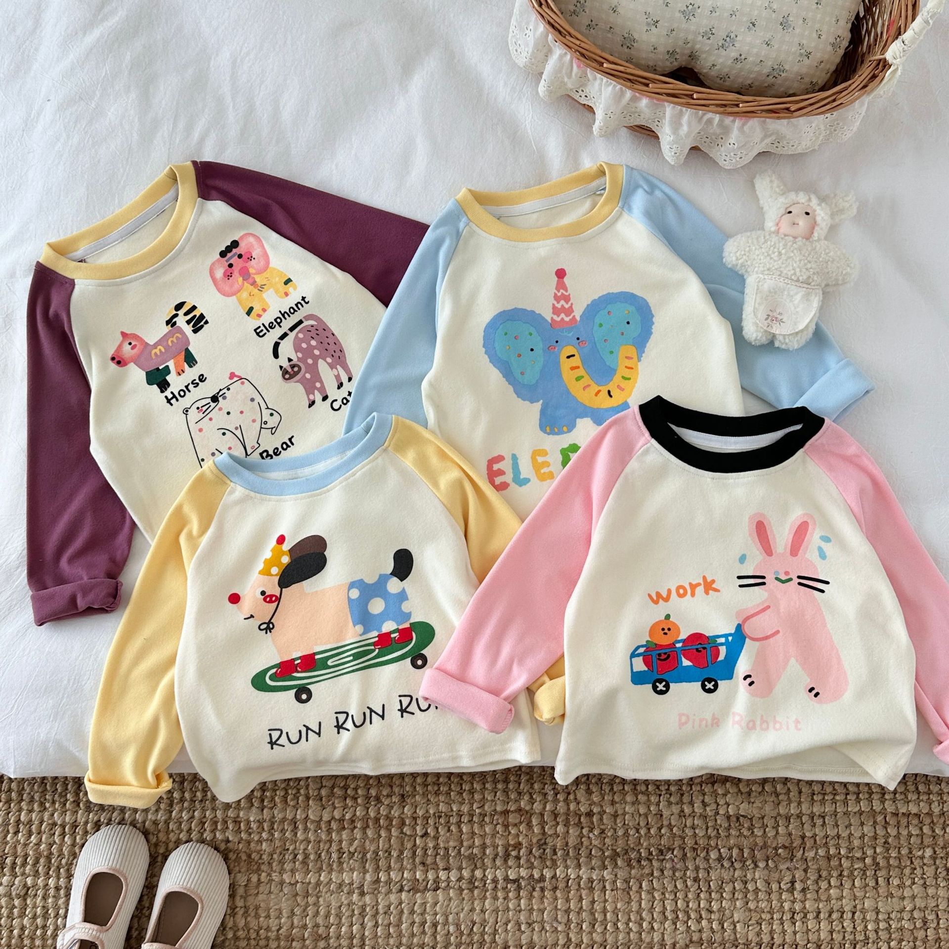 儿童长袖T恤2025秋季新品男女童插肩袖撞色卡通上衣打底衫外套潮