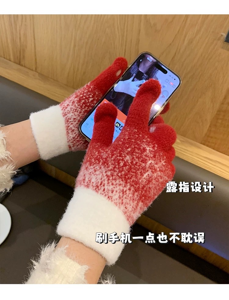 女士手套冬季新款露指加厚毛茸茸针织手套女生韩系可触屏五指写字