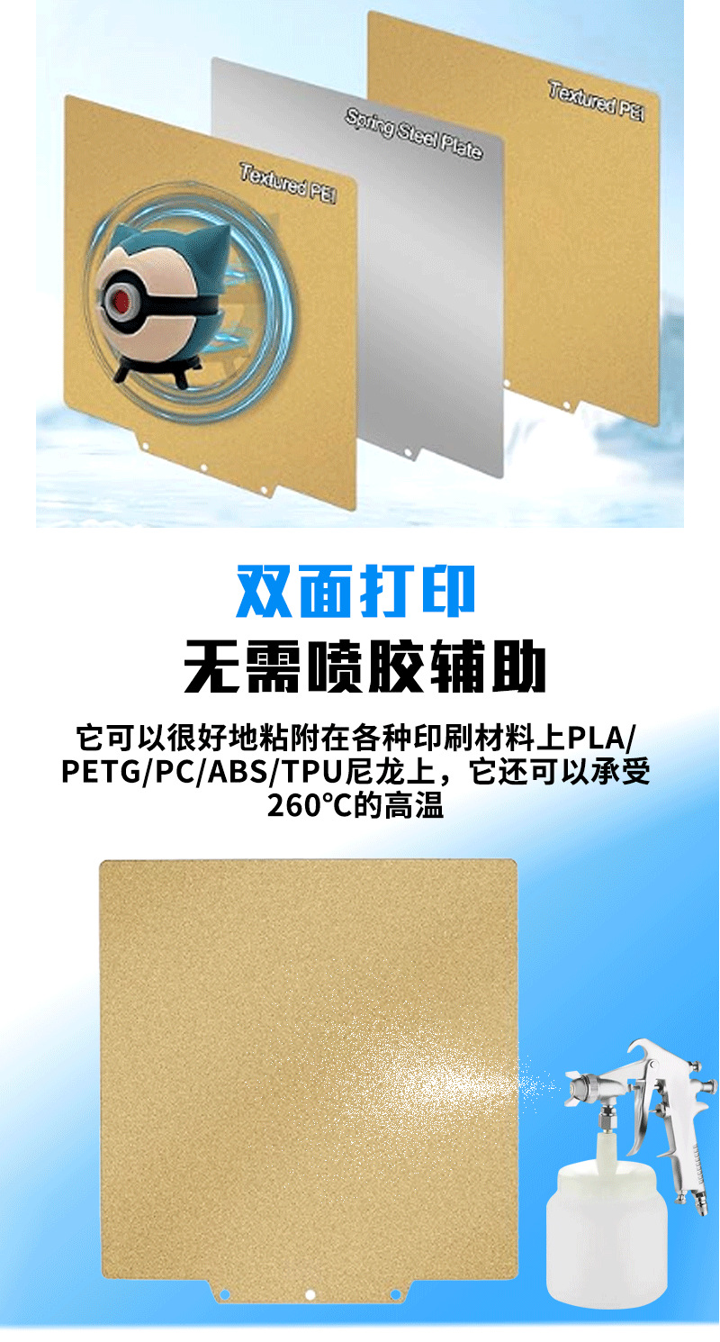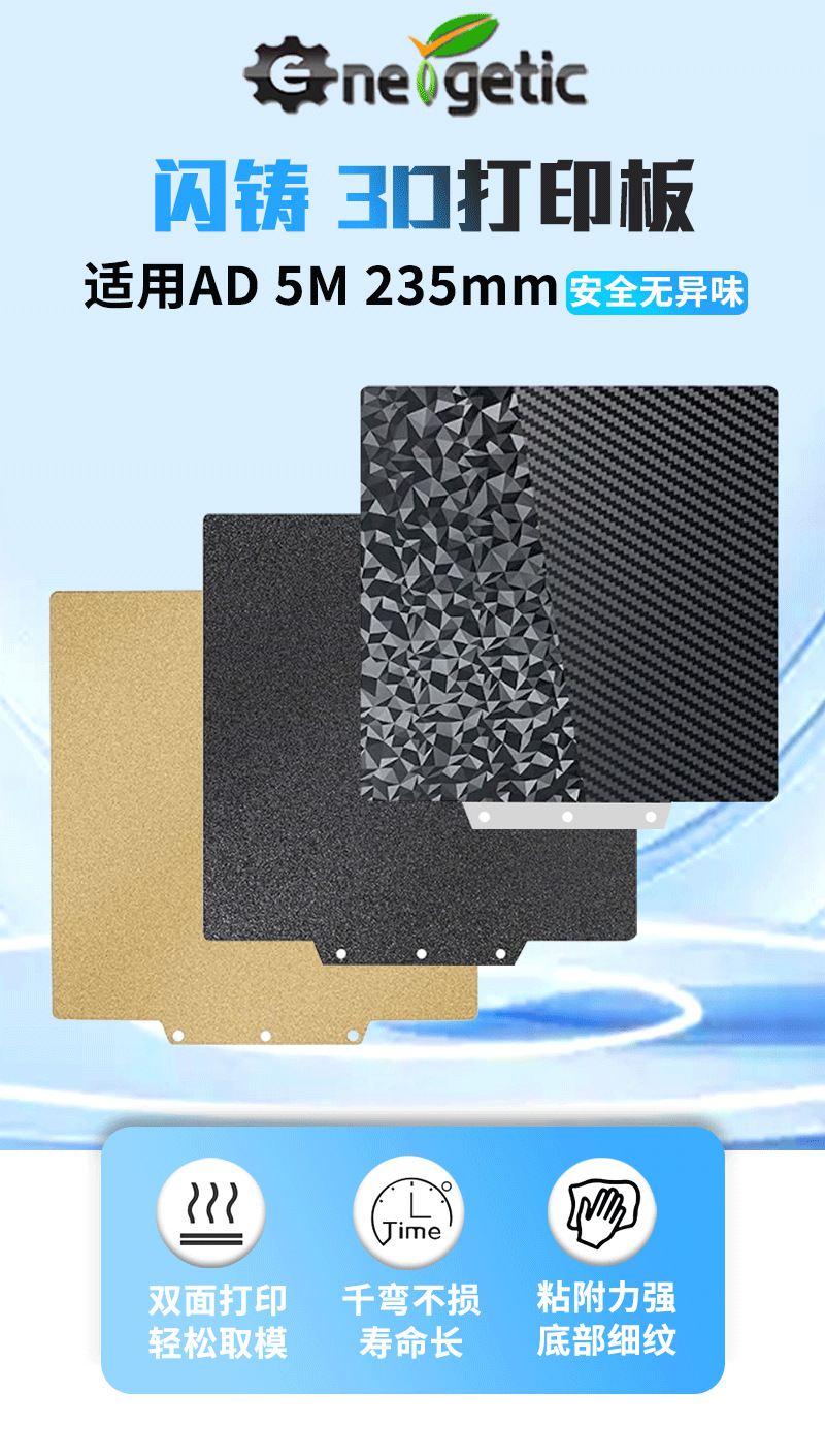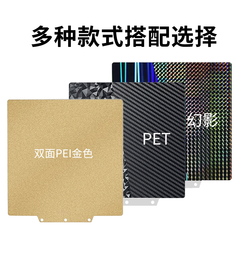 规格 AD5M 235*235 双面pei金色喷涂,AD5M 235*235 双面pei黑色喷涂,AD5M 235*235 金色pei喷涂+peo钻石膜,AD5M 235*235 金色pei喷涂+pet碳纤维膜,AD5M 235*235 peo钻石膜+pet碳纤维膜,AD5M 235*235 幻影+光束膜,AD5M 235*235 金色pei喷涂+pei光面膜,235*235 单磁座