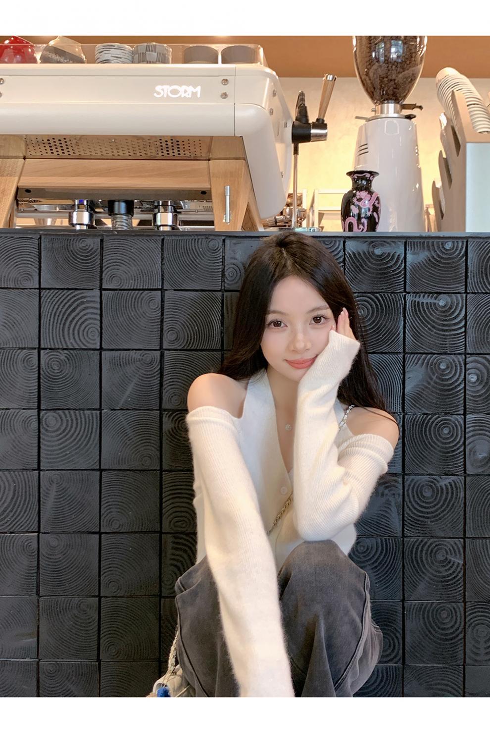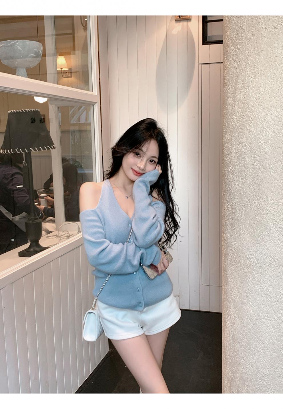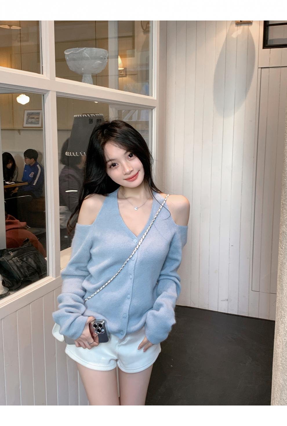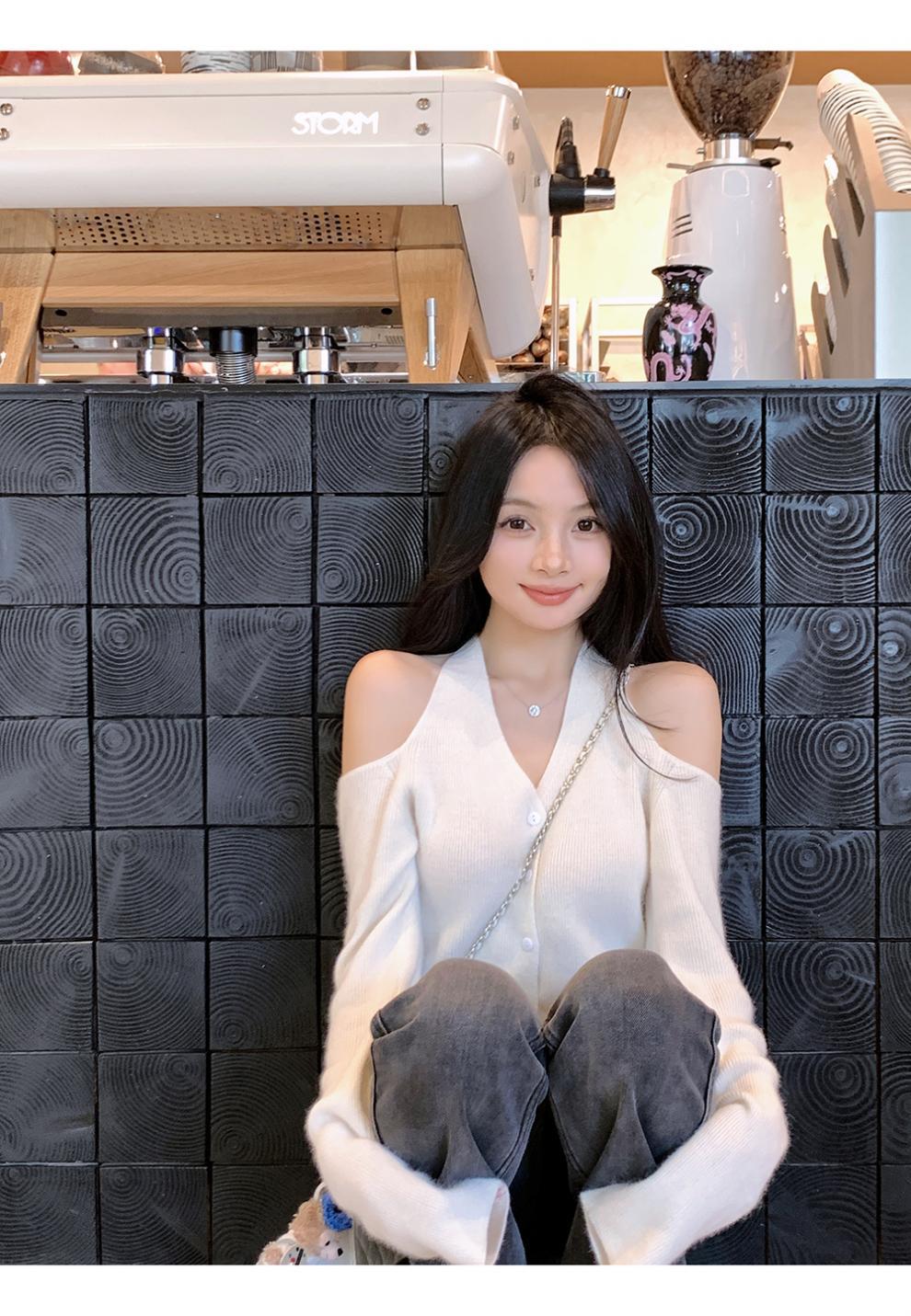 韩系小众露肩挂脖绑带针织衫女2025新款秋季修身内搭开衫毛衣女