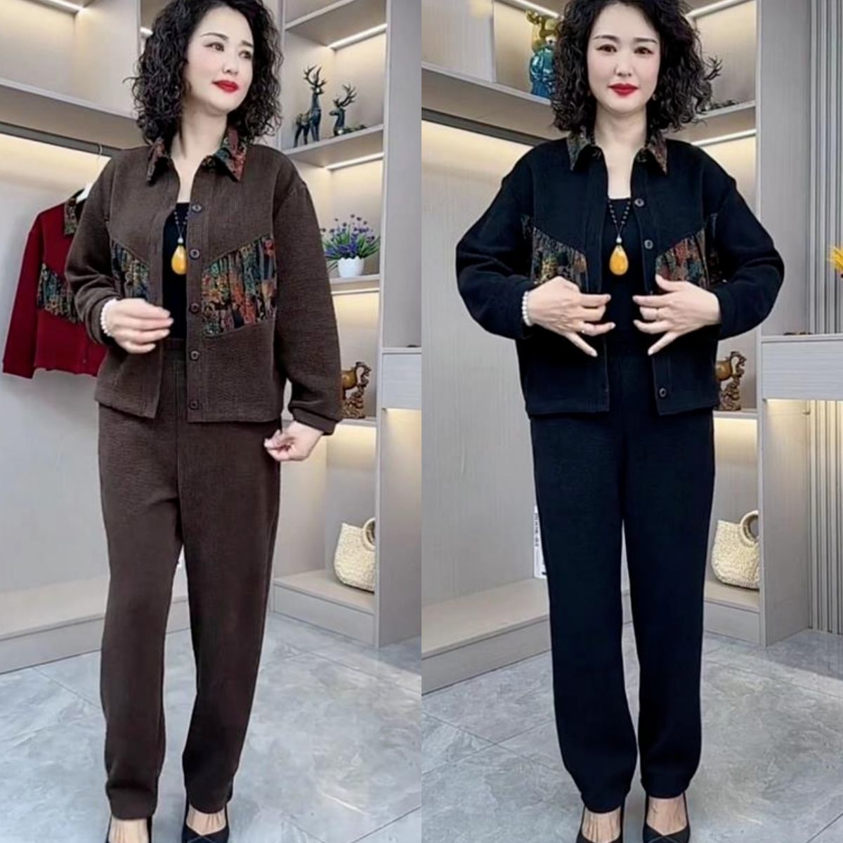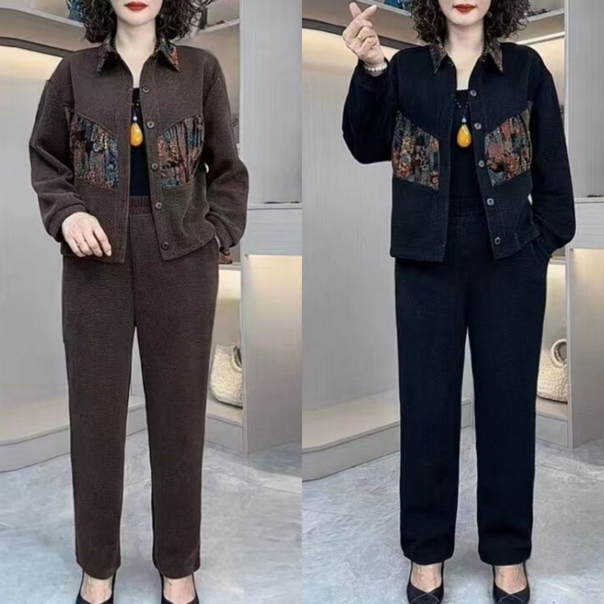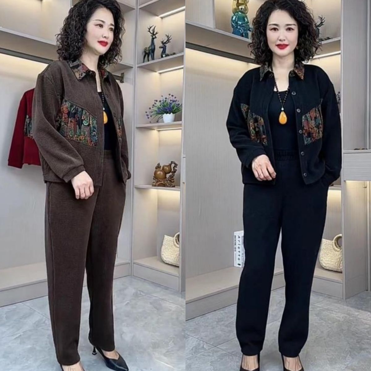 中老年翻领外套运动套装女秋冬宽松休闲洋气妈妈装国风加绒两件套