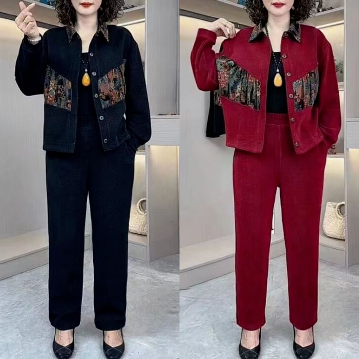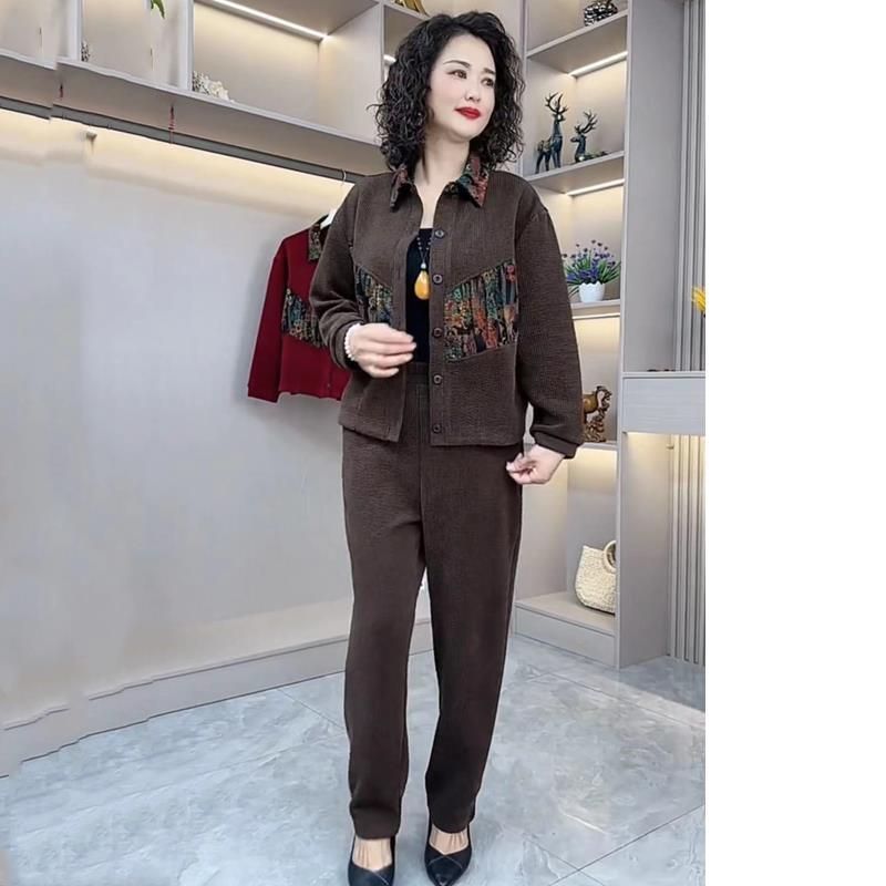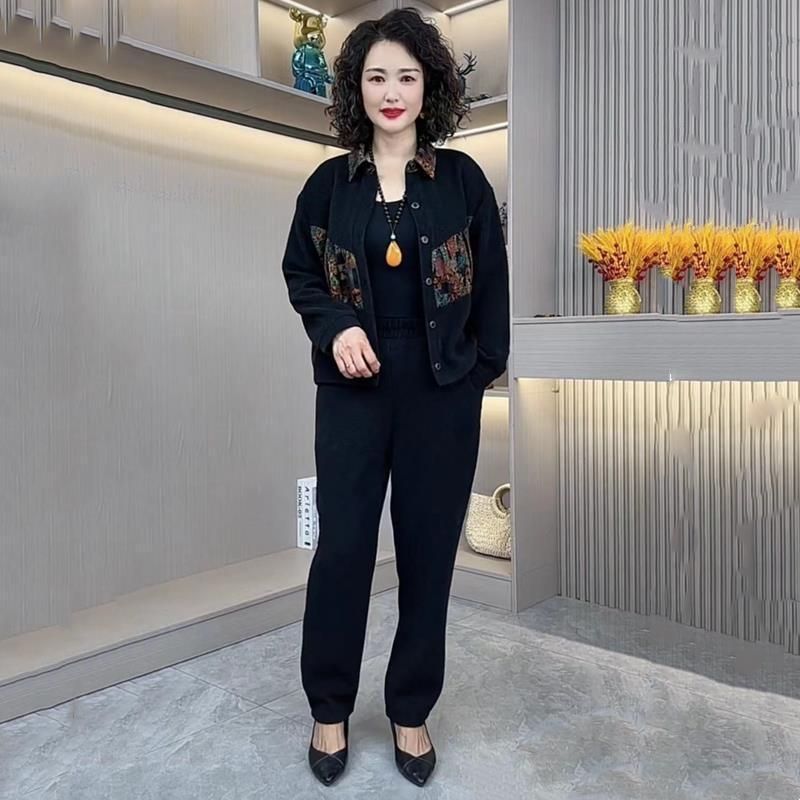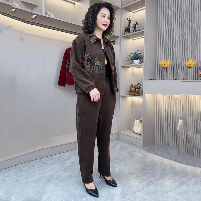 中老年翻领外套运动套装女秋冬宽松休闲洋气妈妈装国风加绒两件套
