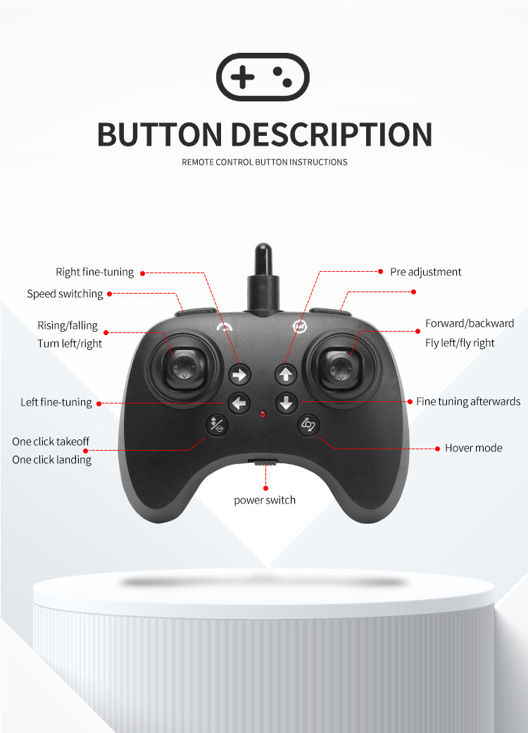 特色功能 前进,手柄遥控,后退,3D翻滚,左侧飞,右侧飞,一键起降