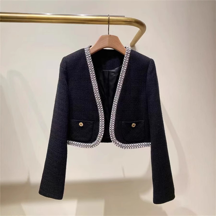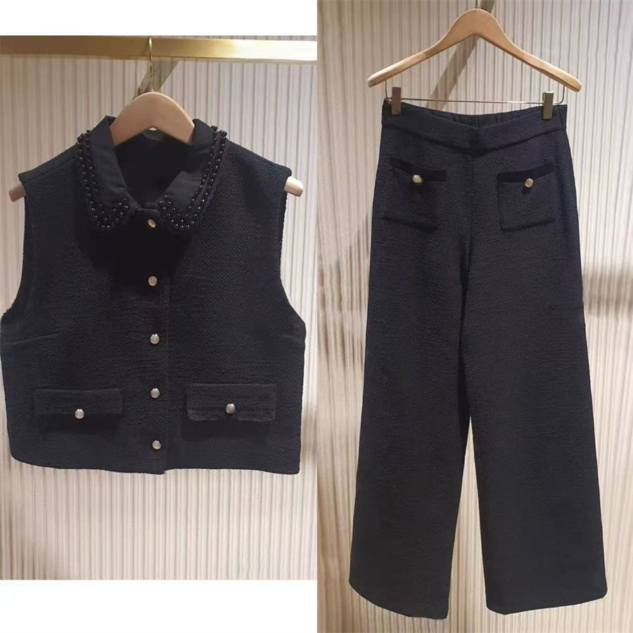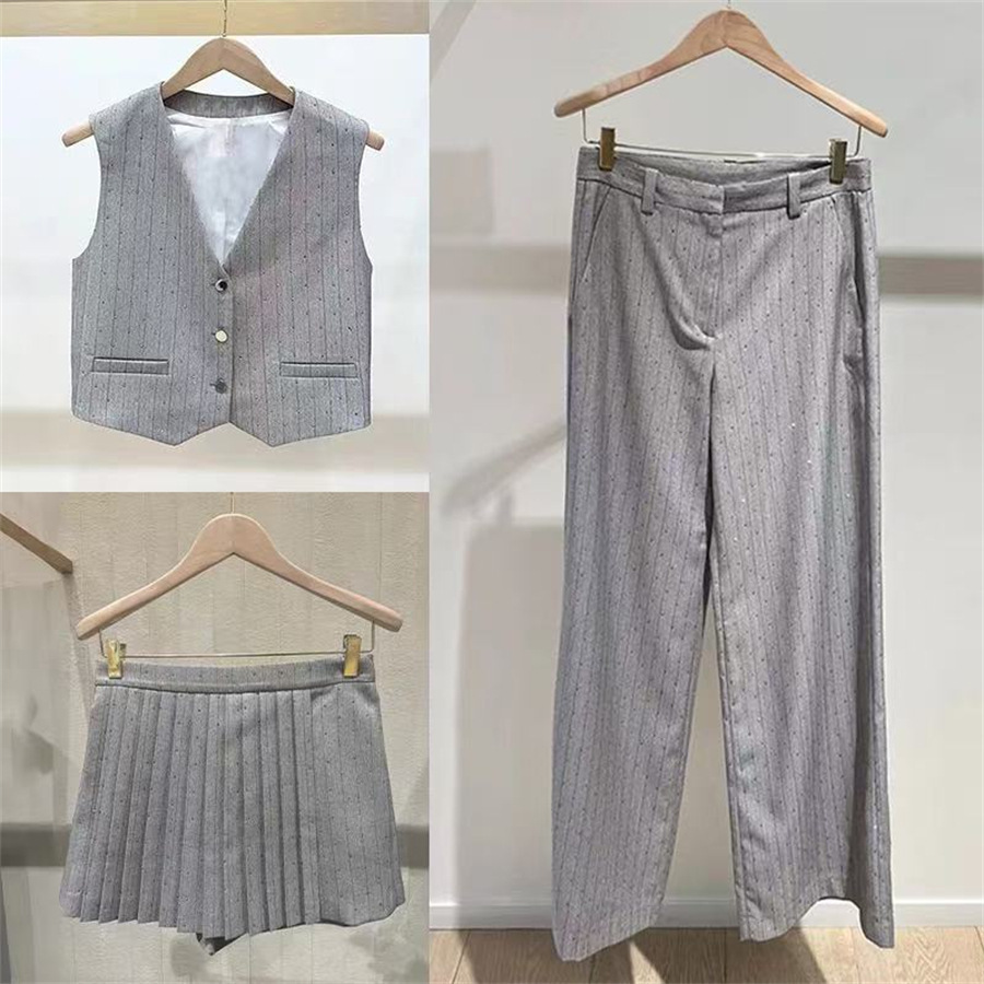 2025早秋新法式时尚翻领双排扣西装外套链条长裤+A字高腰裙裤